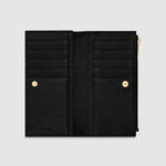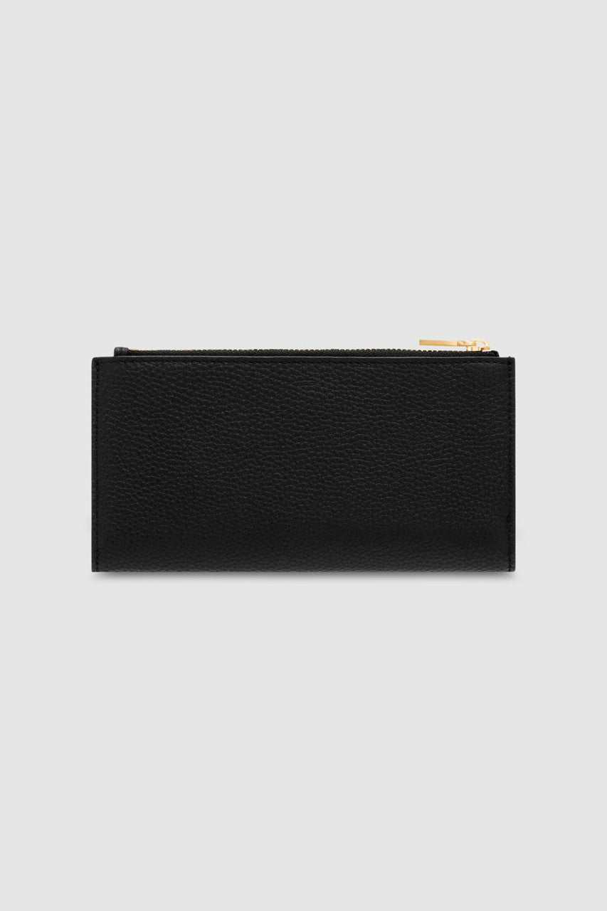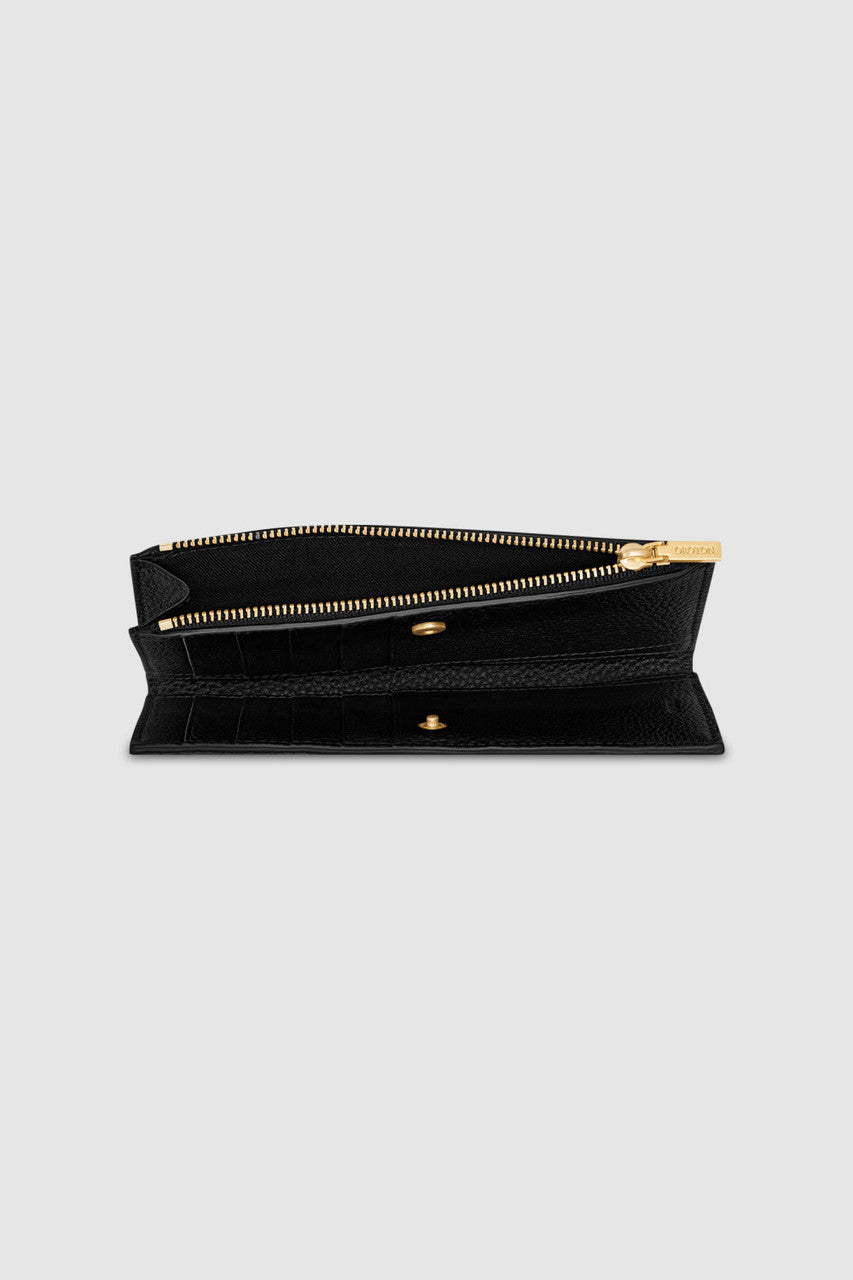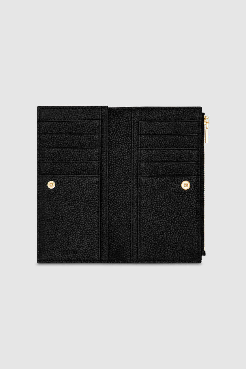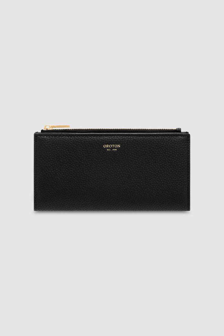 The Oroton Margot Zip Fold Wallet in Black is crafted from a soft pebble leather with brass colour hardware throughout and is complete with a light foil embossed logo. The interior is lined in a lightweight cotton-twill blend and features ten card slots, four note pockets, and a coin zip pocket within the sizeable centre compartment.