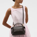 - Non-removable top handle with a detachable, adjustable crossbody strap for versatile carrying options