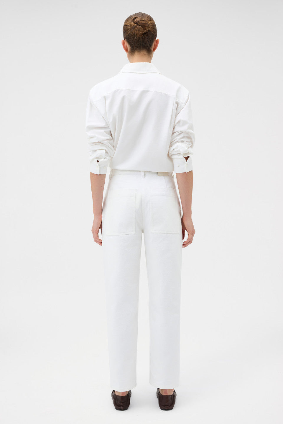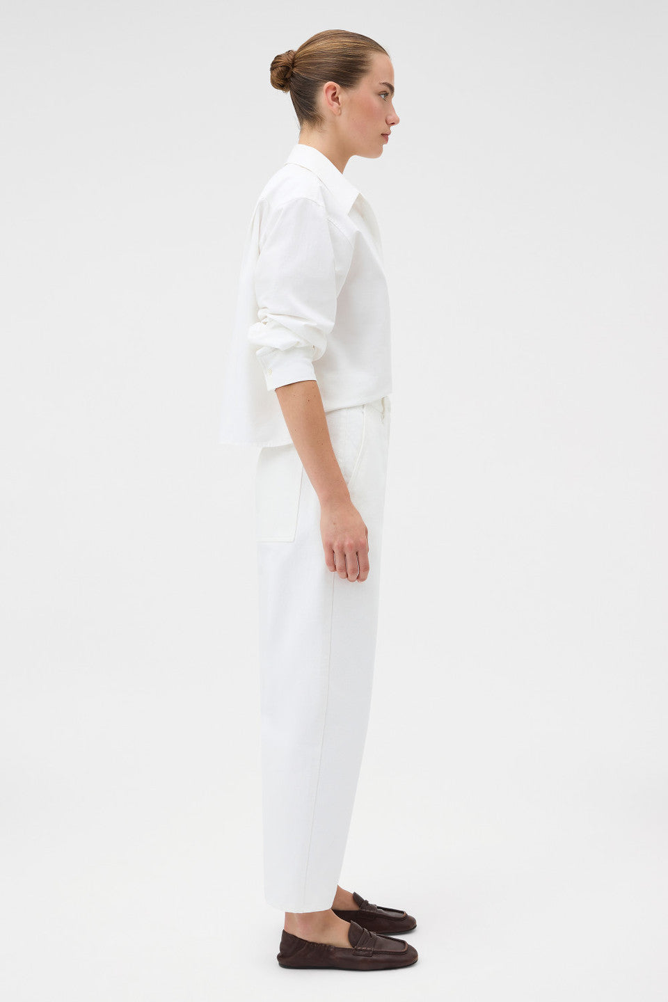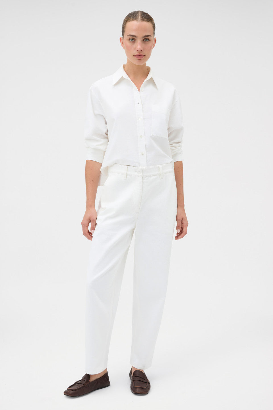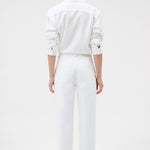 The White Twill Pant is crafted from structured cotton twill with a clean, streamlined silhouette. Designed for versatile wear, it offers a polished foundation suited to both elevated everyday styling and modern wardrobe pairing.