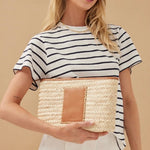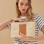 You'll feel effortlessly chic with Etta, ouroversize hand woven palm straw clutch.