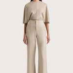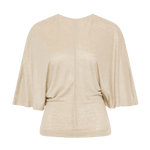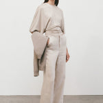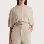 A fitted top, designed from a linen jersey with slight stretch. Featuring a high round neckline and mid-length batwing-style sleeves, it is contoured through the body with a stitch detailing down the front and back.
