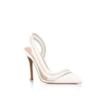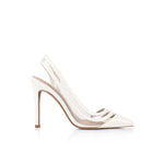 Savannah is crafted in polished patent leather and accented with crystal-clear vinylite, this style defining pointed-toe pump will take you from desk to dinner with its two-tone upper, feminine slingback silhouette and high stiletto heel.