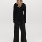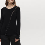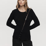 The Poppy Top is finely knitted in a unique Tencel / Cotton / Silk / Cashmere with a subtle lustrous finish. The Poppy Top features a simple silhouette with a round neckline, semi-relaxed silhouette, and long sleeves. The key design feature of this top is the diagonal cut out detail, secured by small metal bar bells.