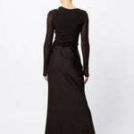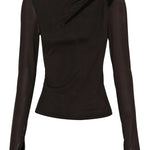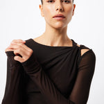 The Punctured Top in rich chocolate features a boat neckline, with an asymmetrical twist cut-out detail. Made from a double layer mesh fabric, the sleeves are single layered with thumb-hole openings. A perfect desk to dinner top, this can be paired with any of our Essentials pants for a more relaxed look or with the Renaissance maxi skirt for an evening out.