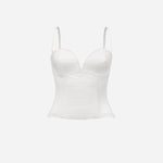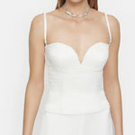 In pure, luxurious ivory silk, the Novice Bustier offers timeless elegance. Its V-wire bust shaping and structured boned bodice create an alluring silhouette. Designed with versatility in mind, the bustier features adjustable and removable shoulder straps and is completed by an open-end invisible zipper at the centre back. Pair with suit pants for an elevated look.