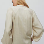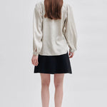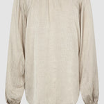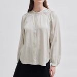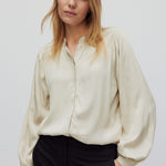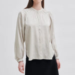 Second Female button-up shirt. Made in soft, drapy viscose with tonal shiny pattern. Featuring mandarin collar and placket at the front with concealed button fastening. Long sleeves with elasticated details at shoulders and cuffs. Button fastening at cuffs. Loose and fluid fit.