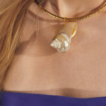 The Shell On A String will for sure get you the feeling of days spent treasure hunting at the beach. Wear it as a bulky pendant or play with the Shell and add it to our Golden Choker.