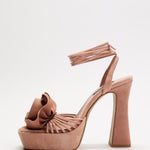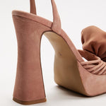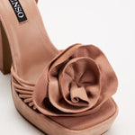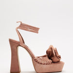 Coral kid suede heeled sandals, featuring a square toe, lace-up straps and 3D flower detail.