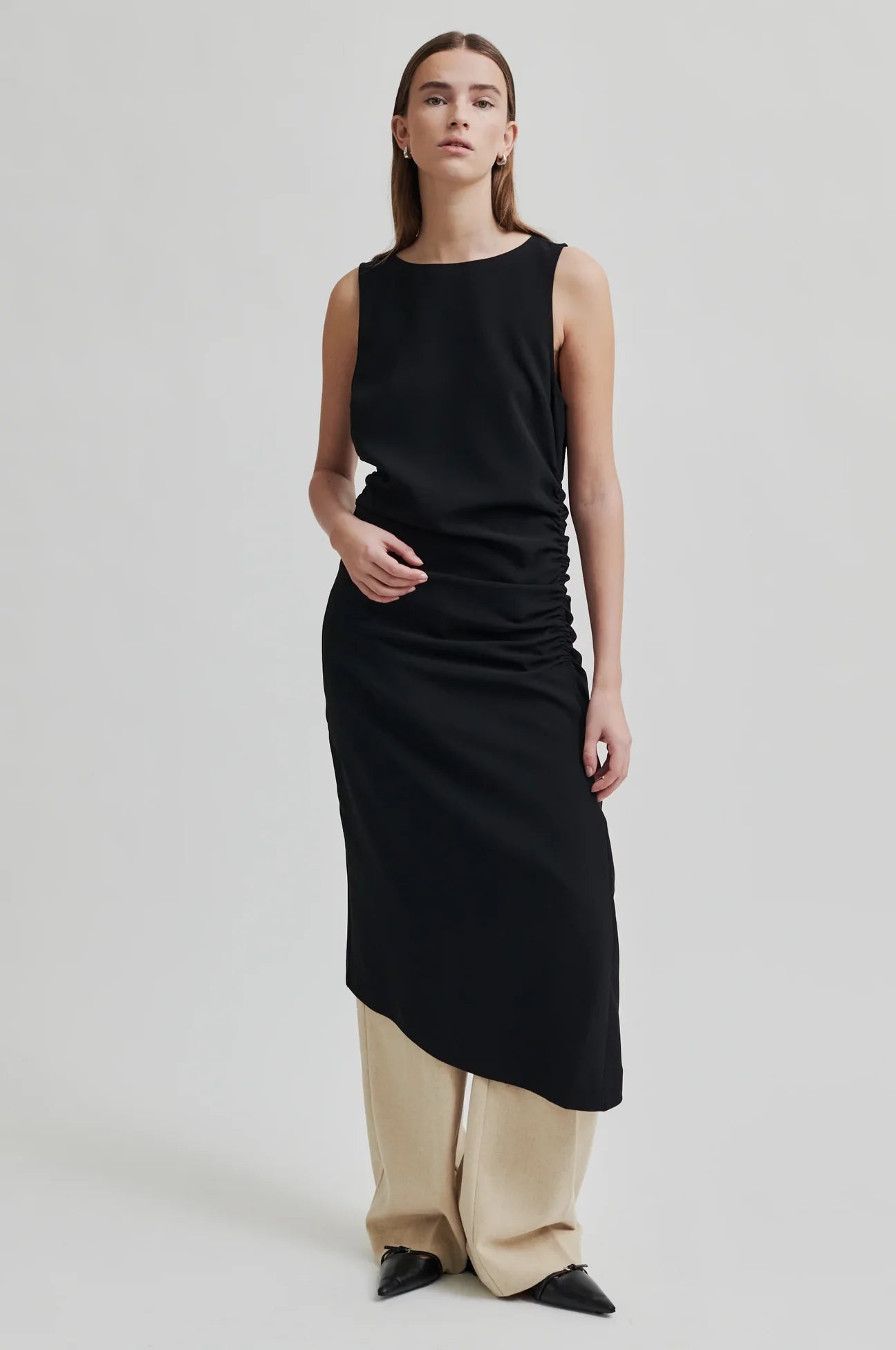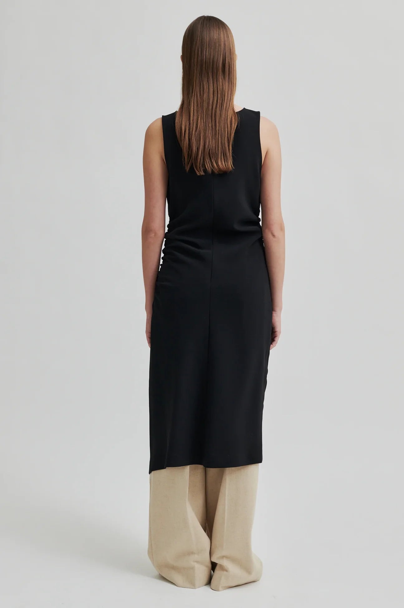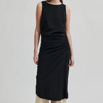 The Angeles Dress in Black by Second Female is a sleeveless dress with gathered sides.