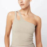 Introducing the Mossman Vice Tank Top in Beige. The Vice Tank Top in beige is the perfect staple piece for your wardrobe. Made from a fine rib fabric, the top features a one-shoulder design and a shoulder cut-out. Pair with the Fable Midi Skirt to take this top from desk to dinner.