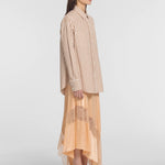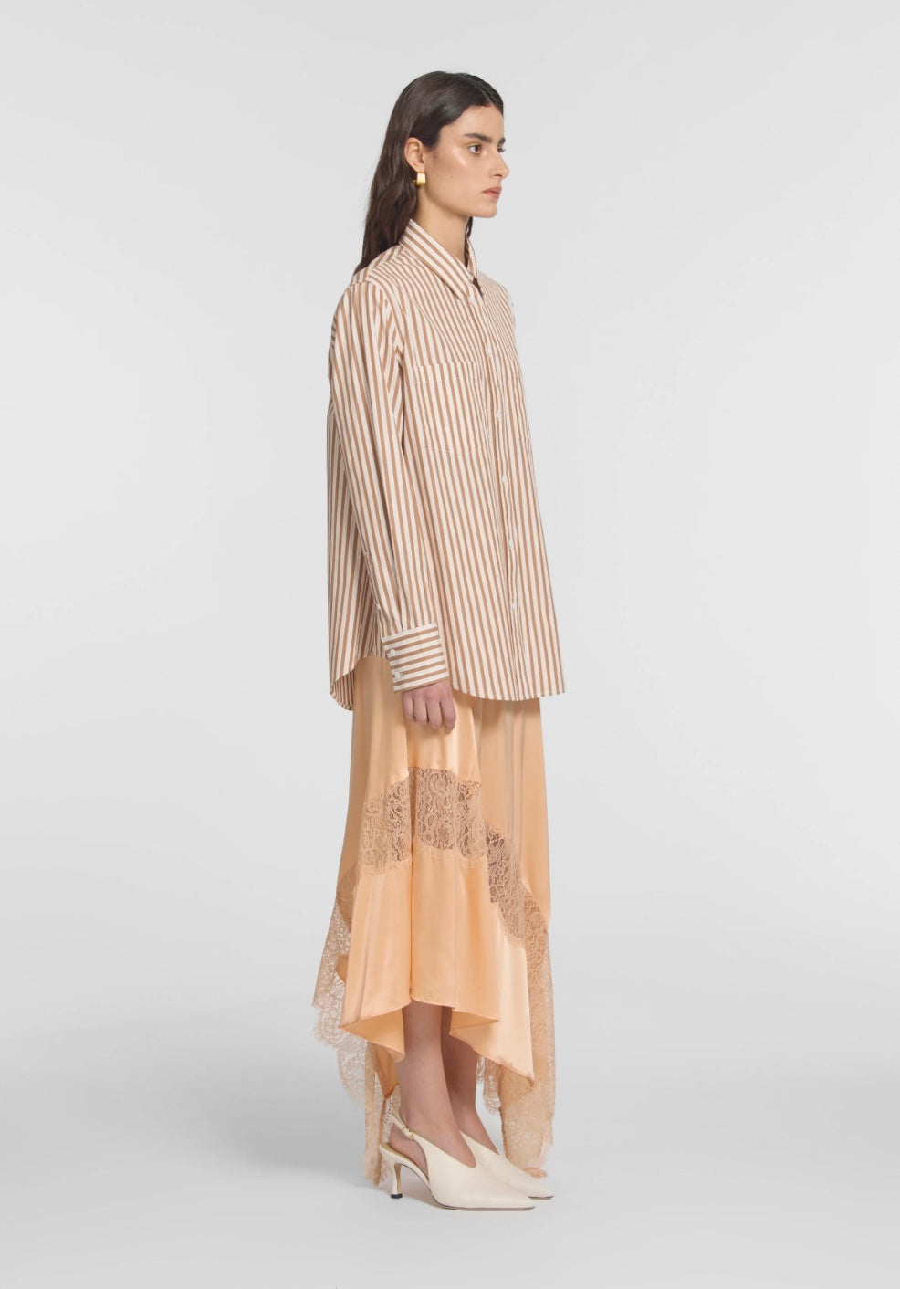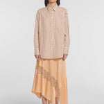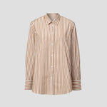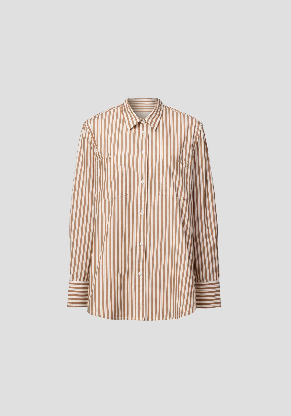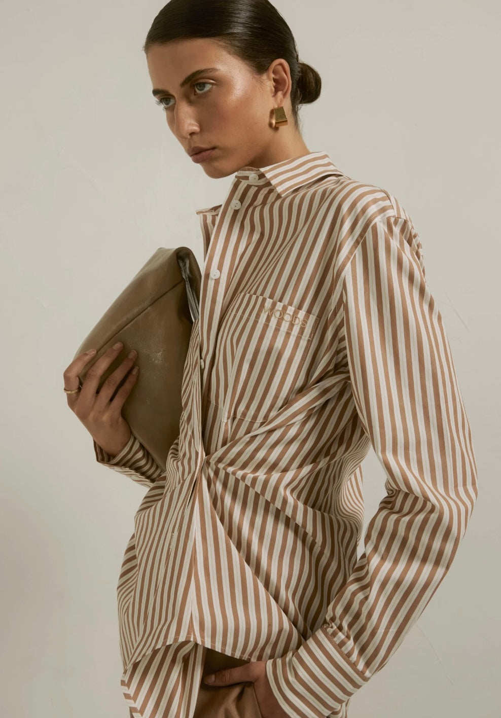 The Convent Shirt, crafted from cotton in a light brown stripe, is your new staple stripe shirt. With a traditional placket, collar, and relaxed fit, it features signature details - logo buttons, WOODS embroidery, and an optional wrap secured with a side seam button. Pair back with this season’s light brown or apricot hues for a striking fusion of feminine and edgy silhouettes.