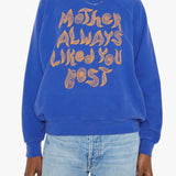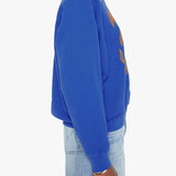 Golden child. An oversized raglan sweatshirt with a crewneck, ribbed hems and a slightly cropped fit. Made from super-soft 100% cotton, the sweatshirt is designed in blue with text in orange on the front.