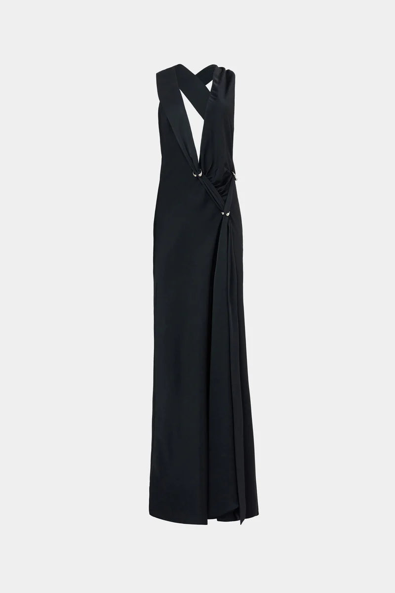 A unique blend of metal hardware and delicate satin fabrication. Finished with three rings on the hip, fixing two waterfall sashes that cascade down the garment. Featuring an asymmetric back and plunge neckline.