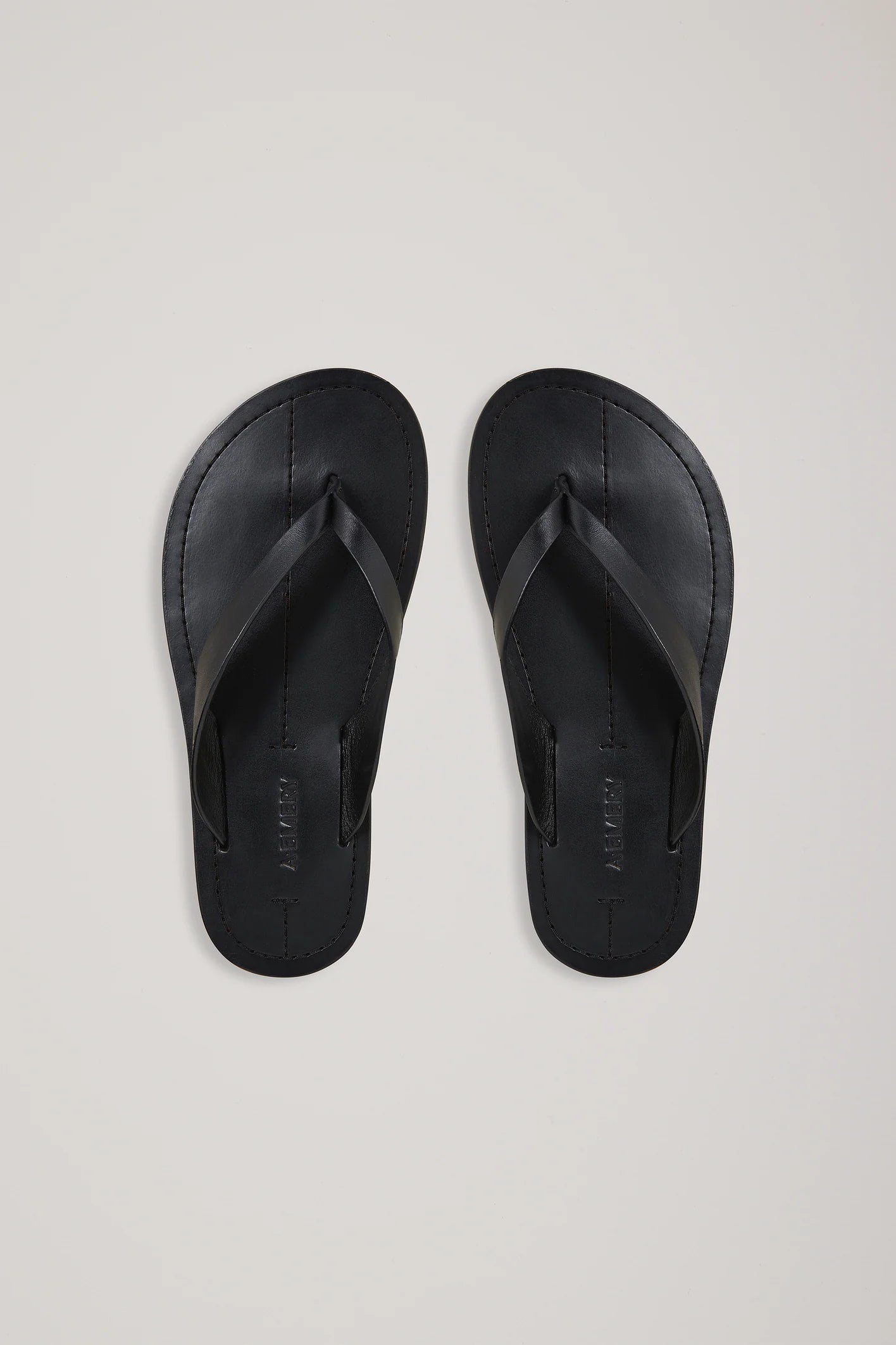 The Flora Sandal is a contemporary flip flop with leather straps that sit atop our new leather footbed with contrast stitching and a rubber tread sole.