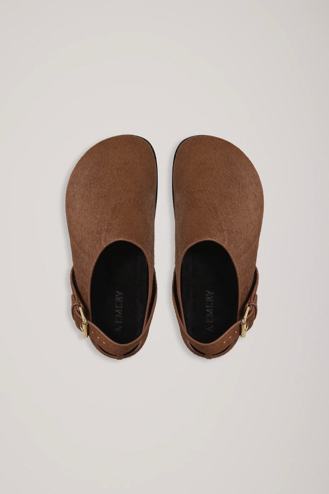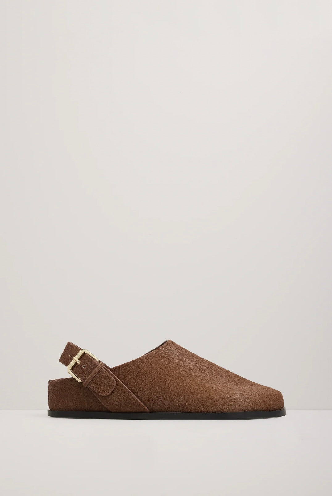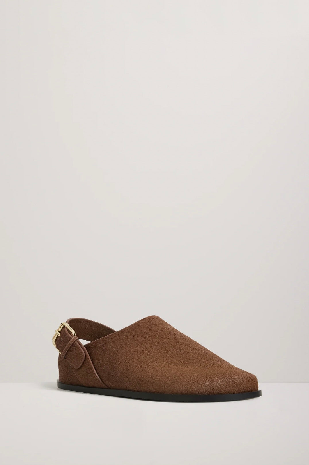 The Louis Clog has been reimagined this season in a pony-hair, featuring an angular slingback strap with a gold statement buckle, sitting atop a cushioned moulded footbed. This style is made from full grain leather with hair on leather upper, leather insole and rubber outsole. Full leather sandals are premium in their make and wear naturally over time.