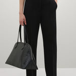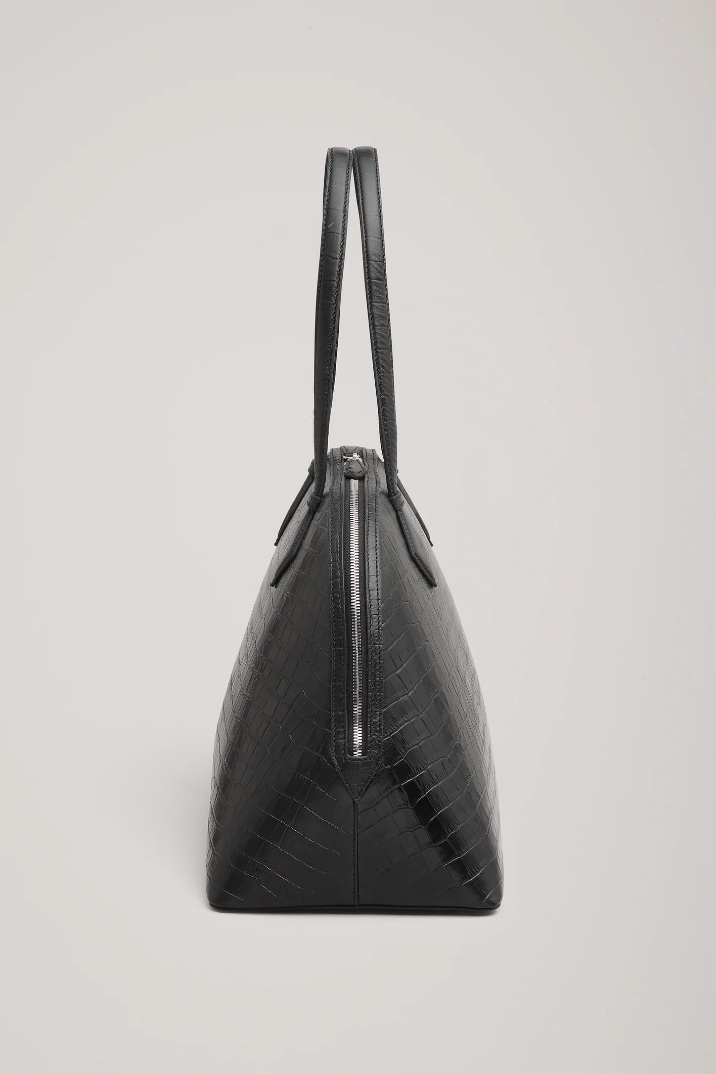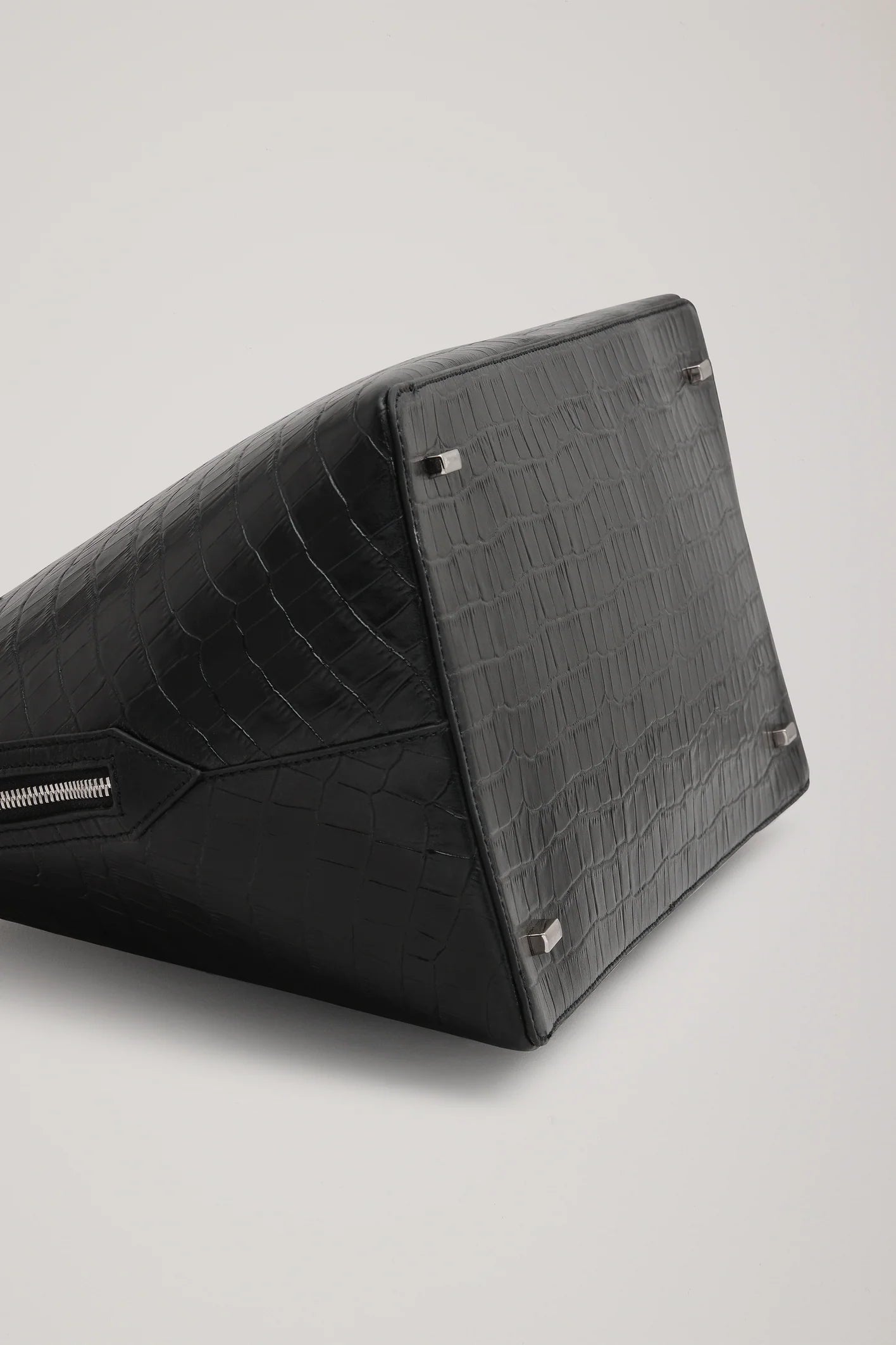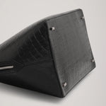 The Harnick Bag is crafted from premium croc embossed leather, defined by a sculptural tapered silhouette. Designed with functionality in mind, it features a two-way double zip closure, structured handles and four protective feet at the base. The interior is lined in a premium cotton twill and finished with a single internal zip pocket offering secure space for essentials.