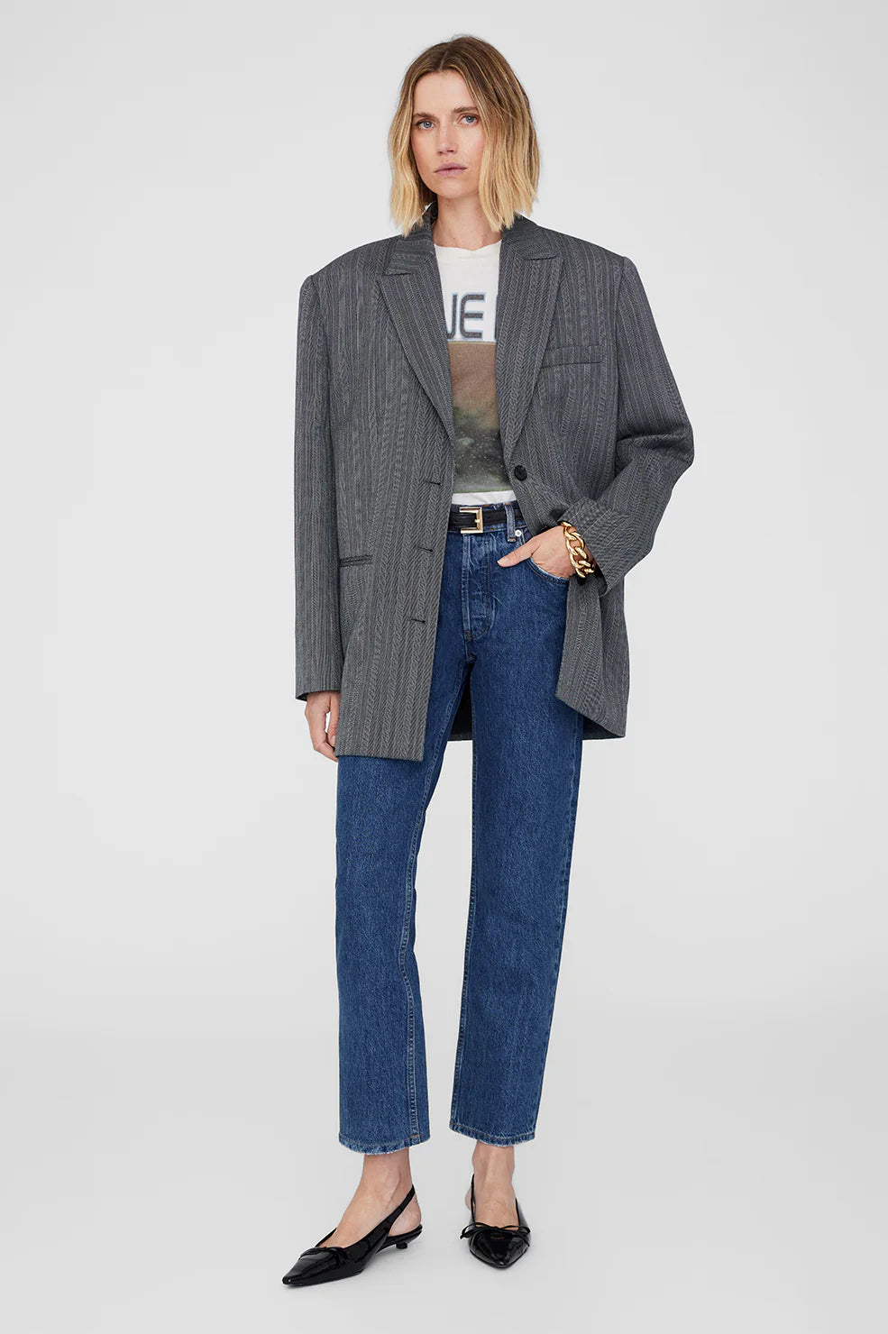 The Cade Tee is cut for a boxy fit with a loose neckline and a slightly shorter body than the Lili Tee. Take your true size.