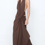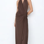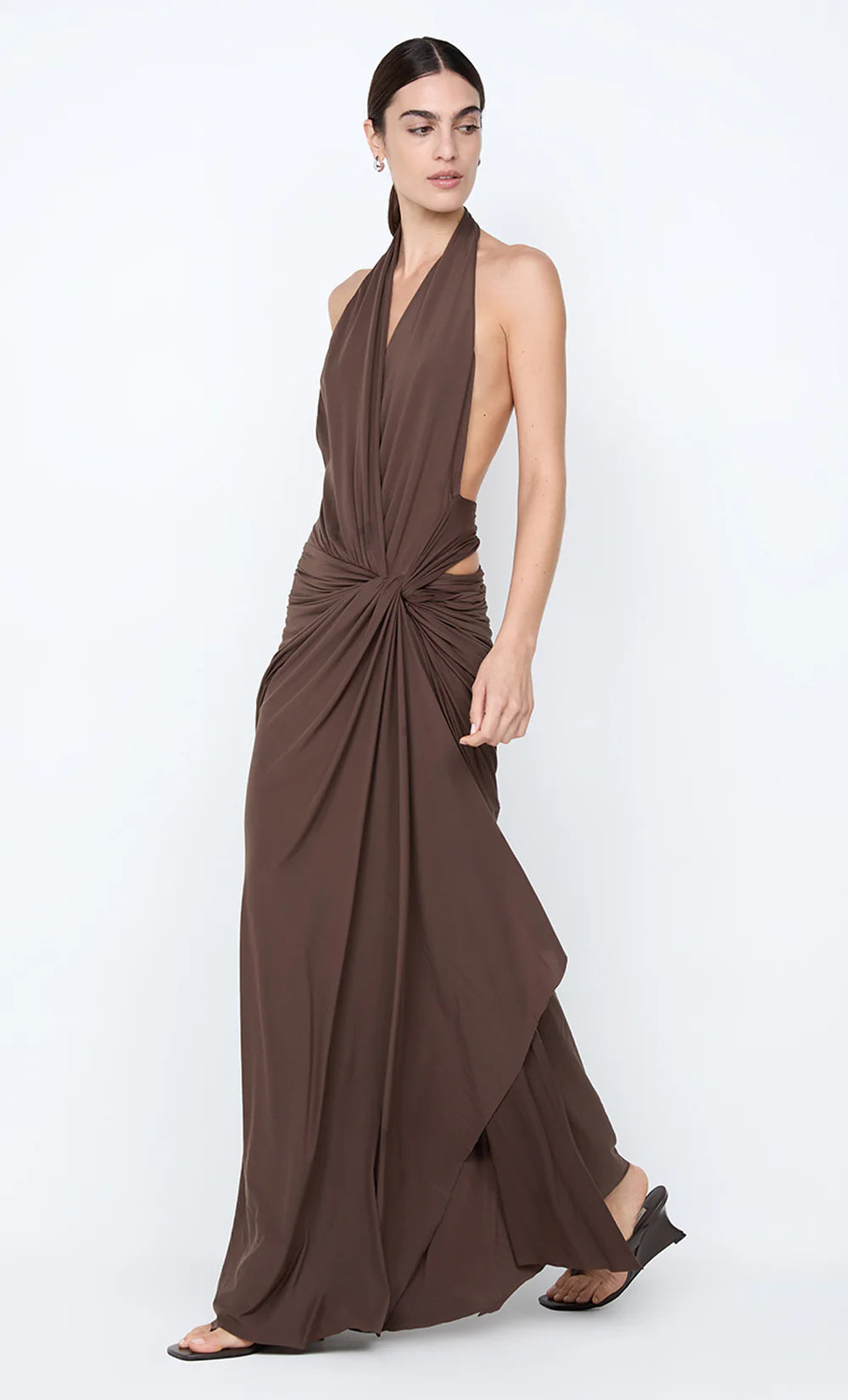 Clementine Twist Dress in Milk Chocolate. This chic maxi dress, crafted from a stretch jersey, features a flattering twist detail and a side cutout, creating a sophisticated silhouette perfect for a night out or elevated holiday styling.