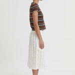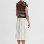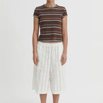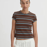 The Aerin Baby Tee in brown brings a modern, playful edge to the baby tee. Made from a soft cotton blend, it follows the contours of the body for a flattering, comfortable fit. A clean crew neckline and short sleeves keep the silhouette minimal, while the subtle green stripes add understated texture. Pair it with the matching Aerin Shorts for a cohesive set, or layer beneath oversized shirts and jackets for a polished, everyday look.