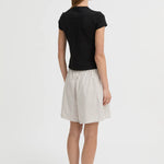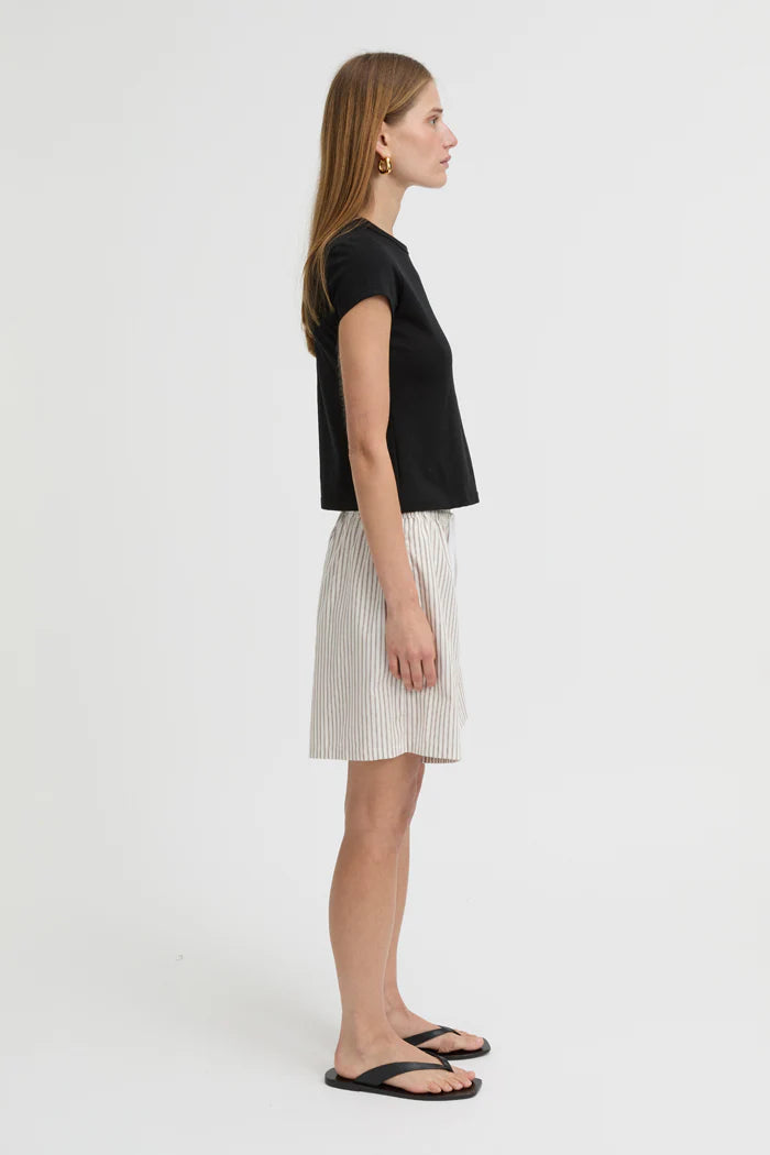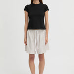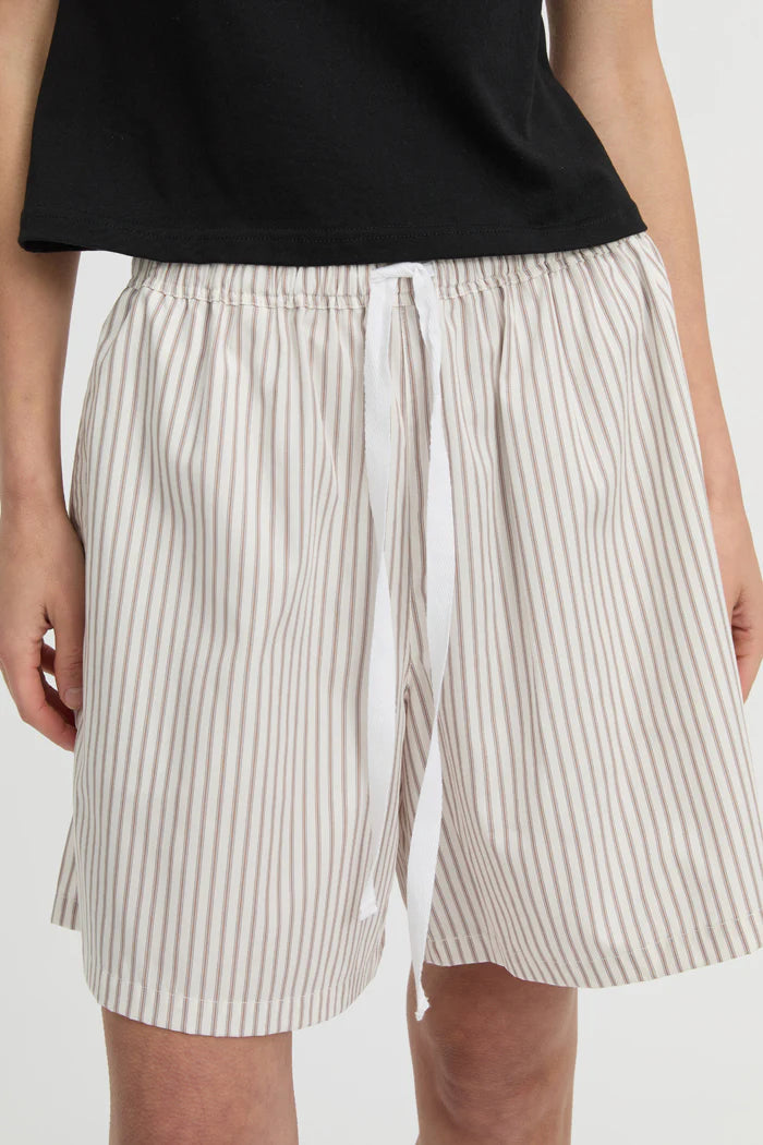 Airy and understated, the Nova Shorts in Beige bring an effortless rhythm to everyday dressing. Crafted from lightweight cotton they balance ease and structure in equal measure. The relaxed silhouette sits mid-to-high on the waist, finished with an adjustable drawstring for a customizable fit. Fine vertical stripes lend a quiet refinement, while the fluid drape keeps the mood relaxed.