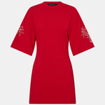CAMILLA AND MARC Eviva mini dress in poppy red with beaded chainstitch embroidery. Strong shoulder, straddle stitch details, blind hem.