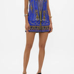 My Fair Pharaoh V Neck Top With Knot Back captures the intricate gilded artworks of ancient Egyptian gods and goddesses that shimmer against a regal blue. An effortlessly elegant silk top this knot back tank features an open back split to create a relaxed fit throughout the body. Wear back to front as a cropped halter transforming the slit into a keyhole with tie front detail.