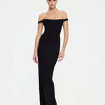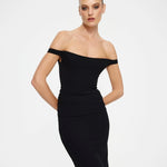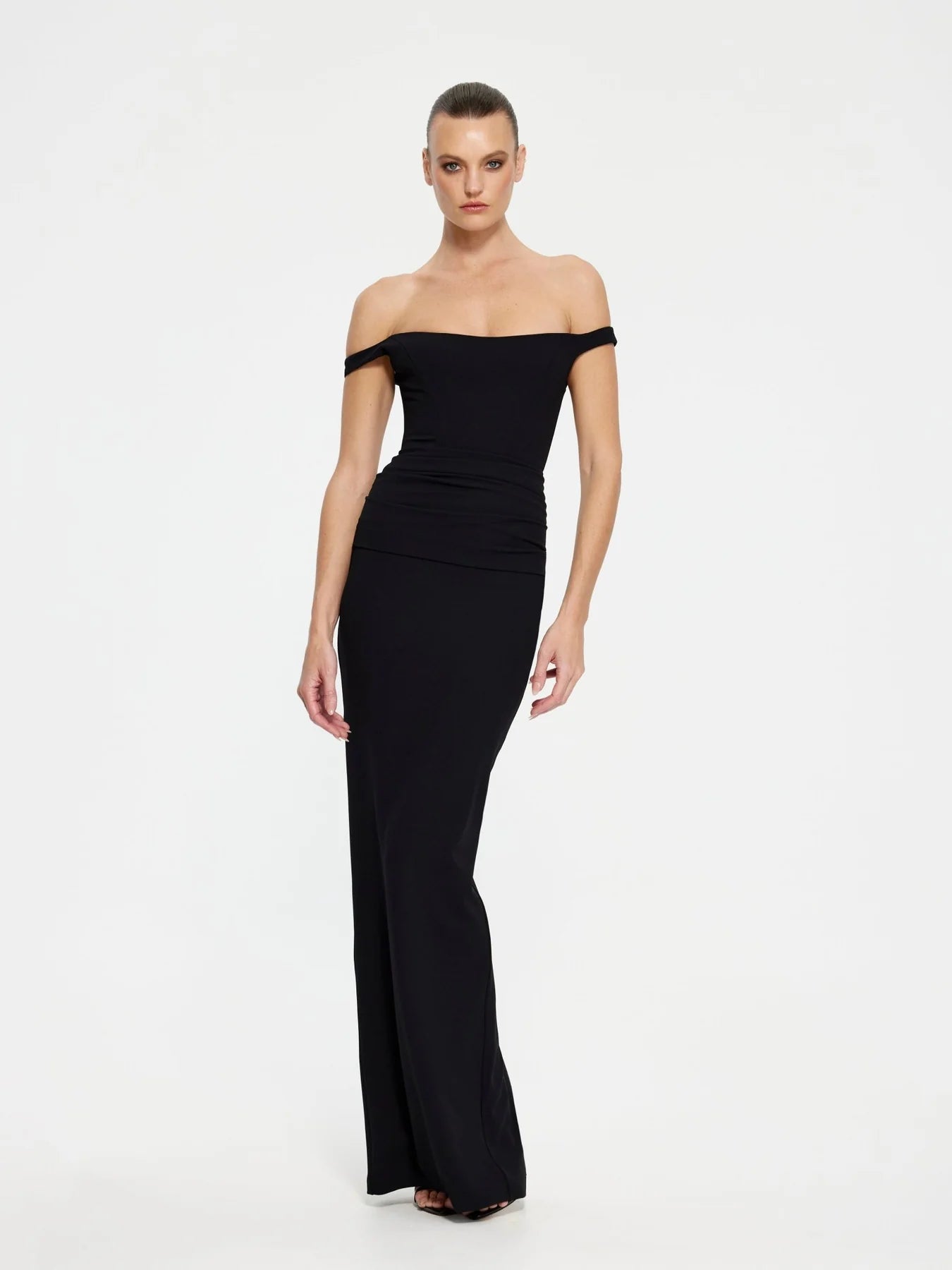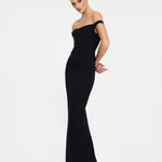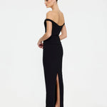 Off shoulder silhouette with a split back for ease of movement, featuring delicate ruching through the hips and body for the most flattering drape on the body.