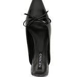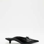 Ebony chrome kitten heel mules featuring a pointed toe, slip-on style and bow at the front.