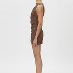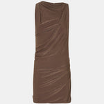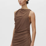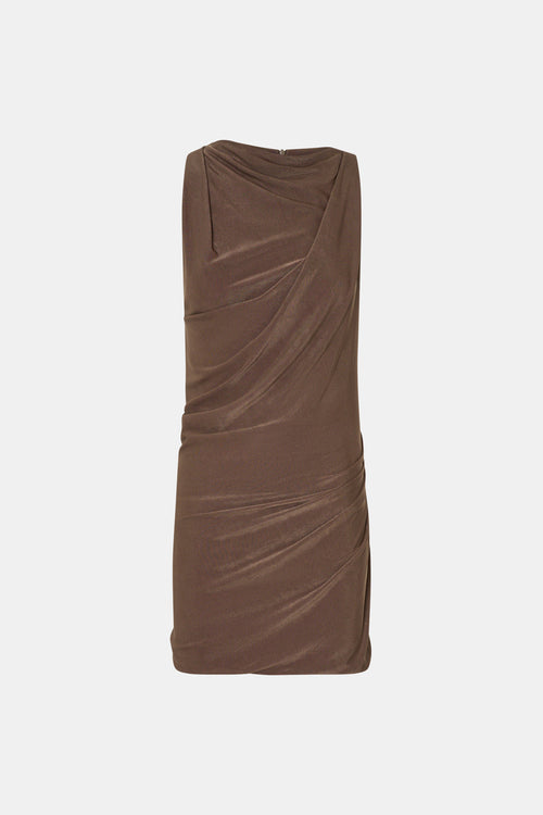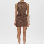 CAMILLA AND MARC Ashen copper brown wrap mini dress with cowl neckline. Draping at waist, fully lined. Centre back concealed zip.