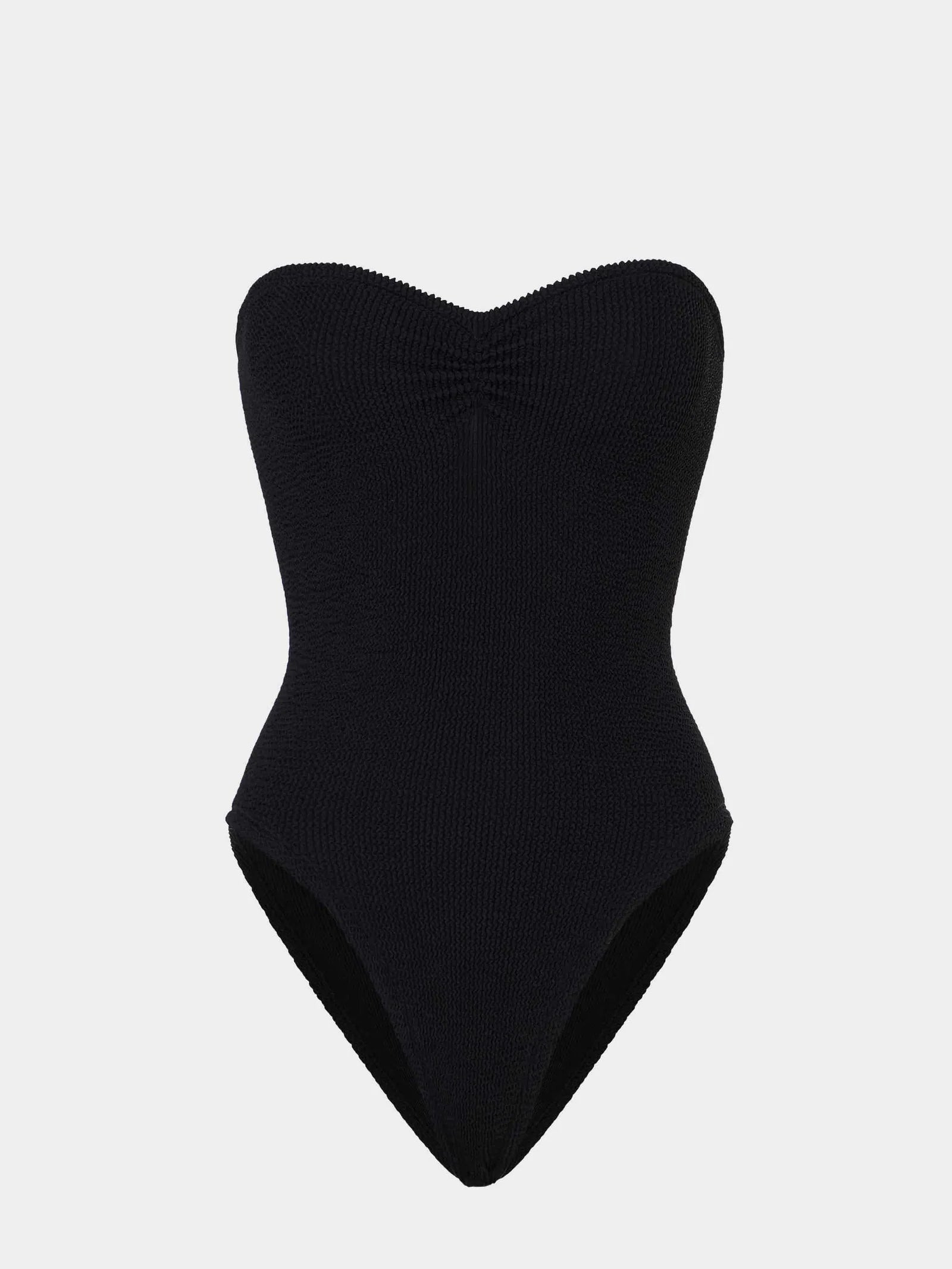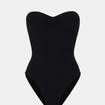 Strictly no tan lines in this strapless style. Minimal meets glam with the Brooke swimsuit's ruched sweetheart neckline and figure-sculpting silhouette.