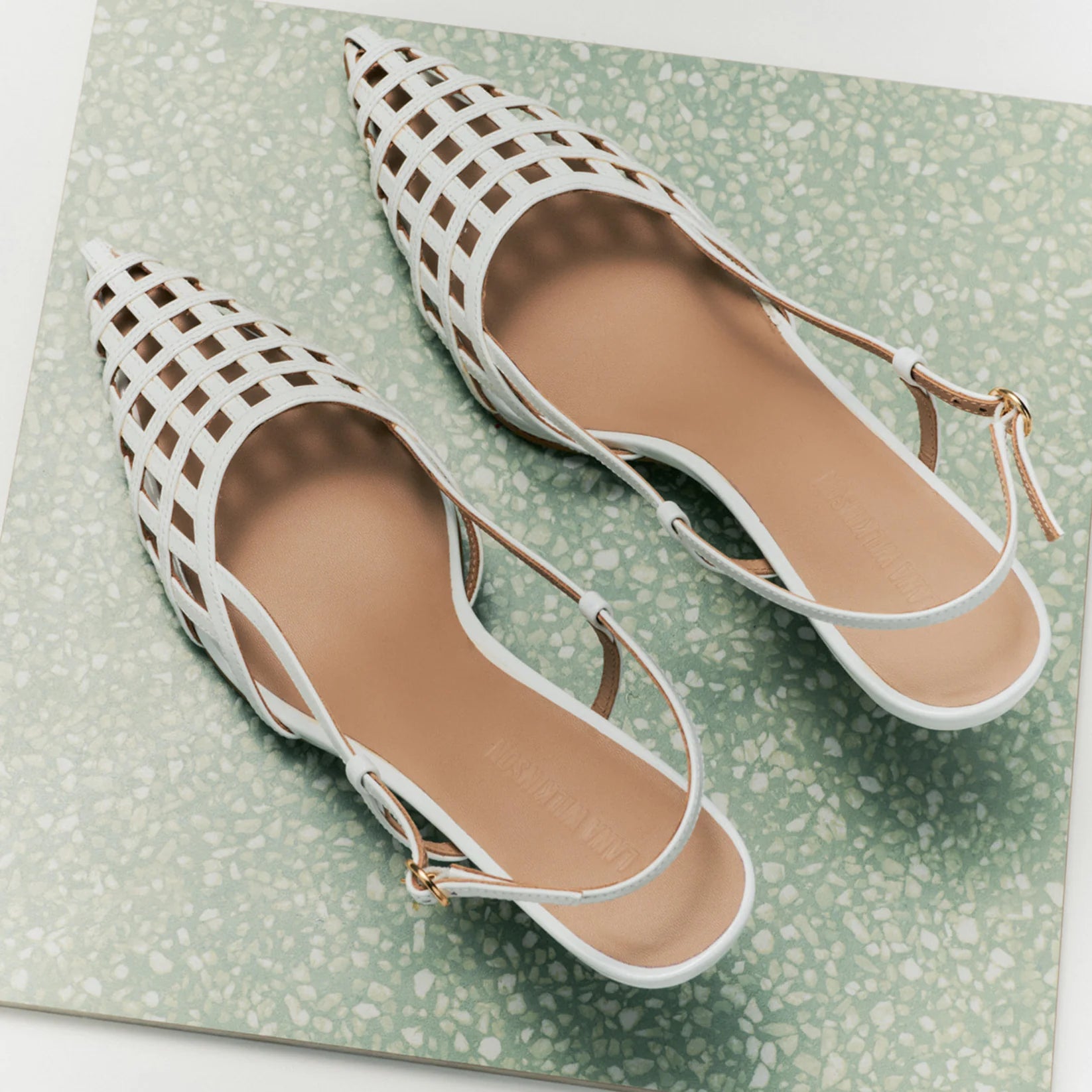 Crafted in crisp white leather, the Miranda features elegant open cage details across the toe and a chic buckle fastening. The clean, minimalist design is complemented by a modest heel, offering a refined yet effortless silhouette. Perfect for brightening daytime looks or adding a polished touch to evening outfits, this versatile pump balances modern sophistication with timeless appeal.