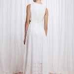 The Amelia dress in white is made from premium 100% linen, featuring a delicate cutwork embroidery bodice panel, cut-out side details and a sweeping full embroidered skirt.