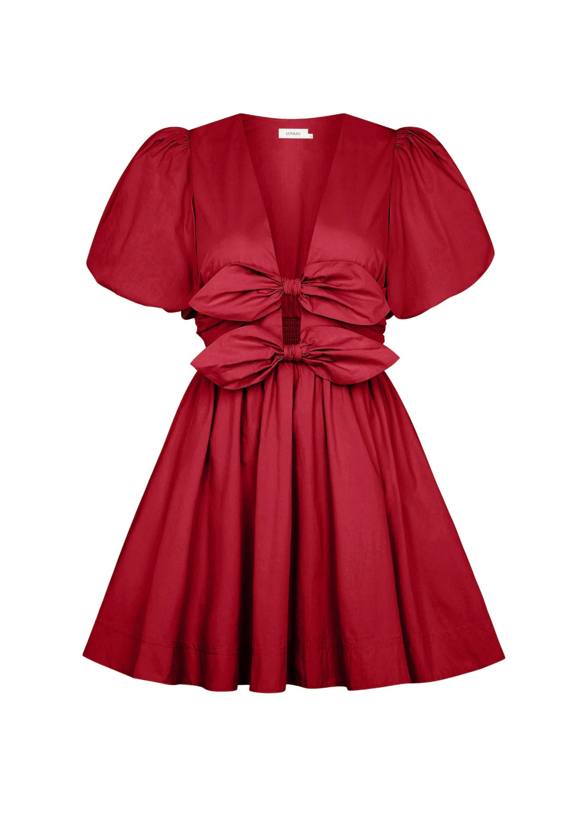 The Devon mini dress in red is made from butter-soft cotton poplin, featuring double bow front details, blousy puff sleeves and a flattering deep V-front neckline.