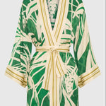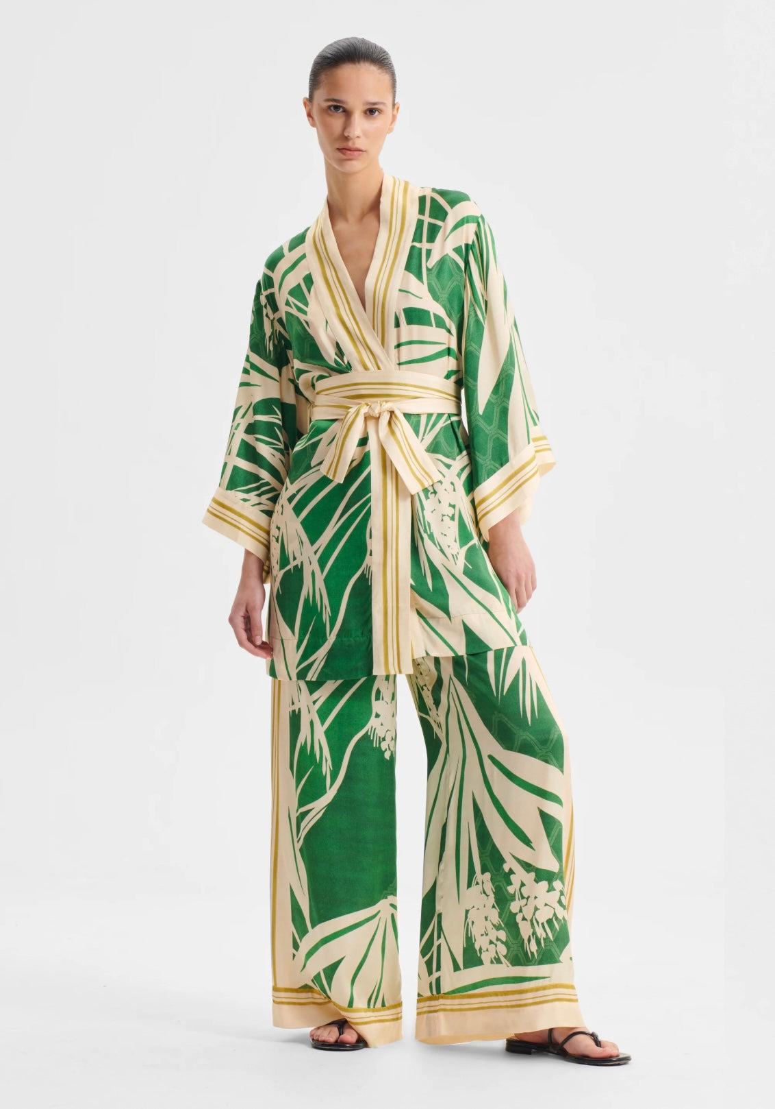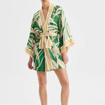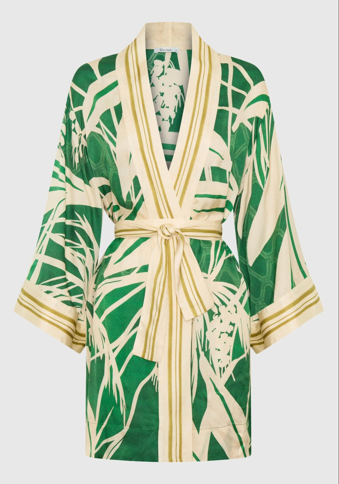 The Sorrento Robe in Lenzing™ Ecovero™ satin-finish fabrication showcases an exclusive Morrison print. A wrap silhouette with wide bracelet sleeves and side seam pockets offers both comfort and sophistication. The border trim at the front, cuffs, and tie adds refined contrast to this above-knee, relaxed fit style.