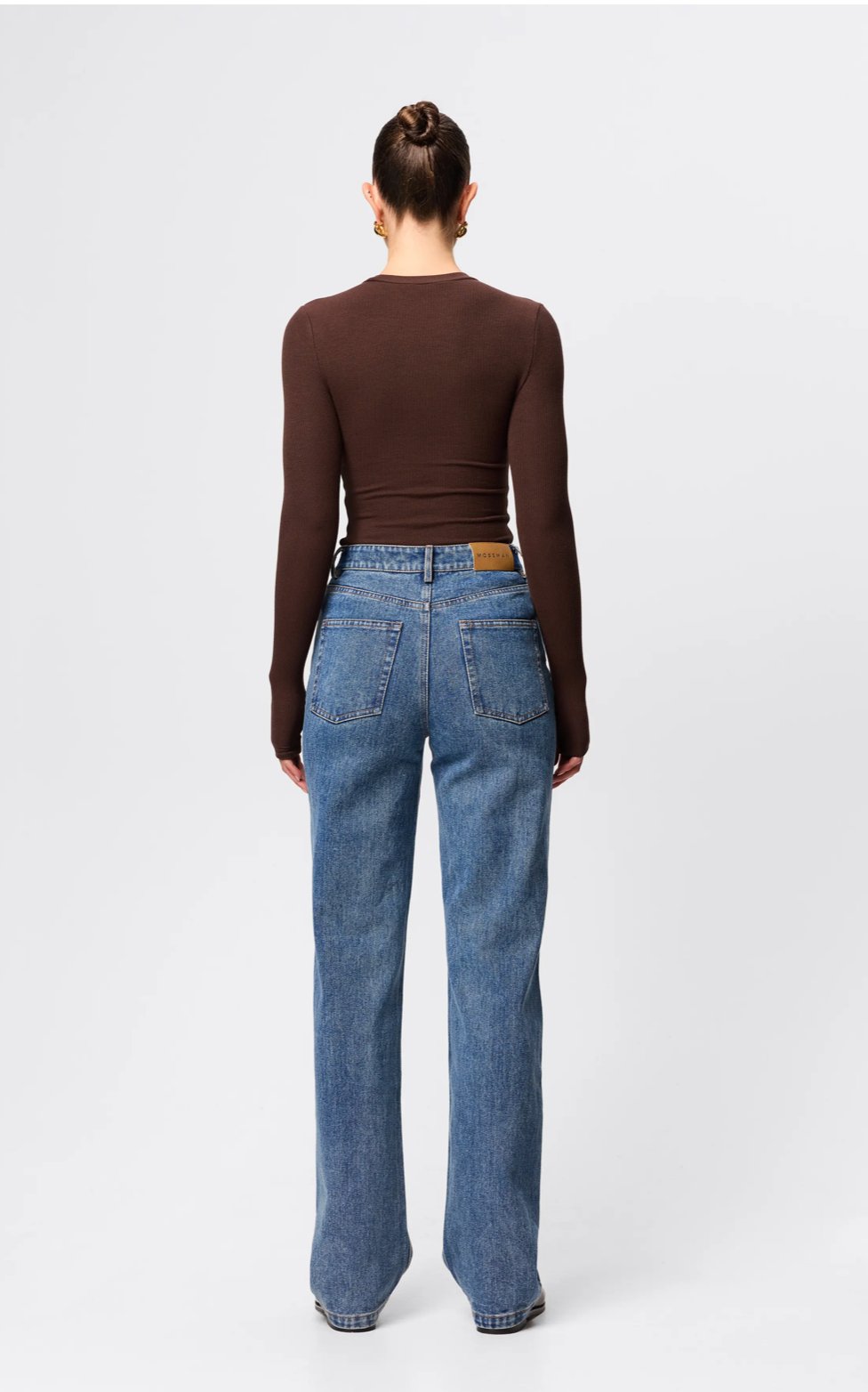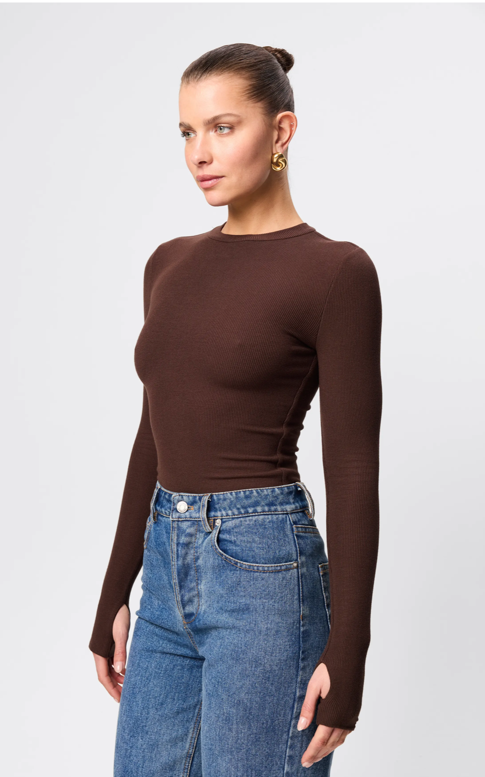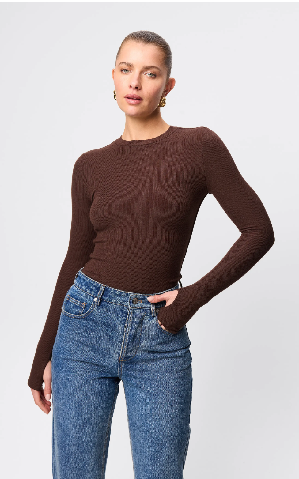 The Brooklyn Top in Chocolate is your new go to ribbed jersey piece. This extremely soft double layered, lightweight top features a high round neckline and long sleeves with thumb openings. The top is conveniently designed to be paired with existing pieces in your wardrobe.