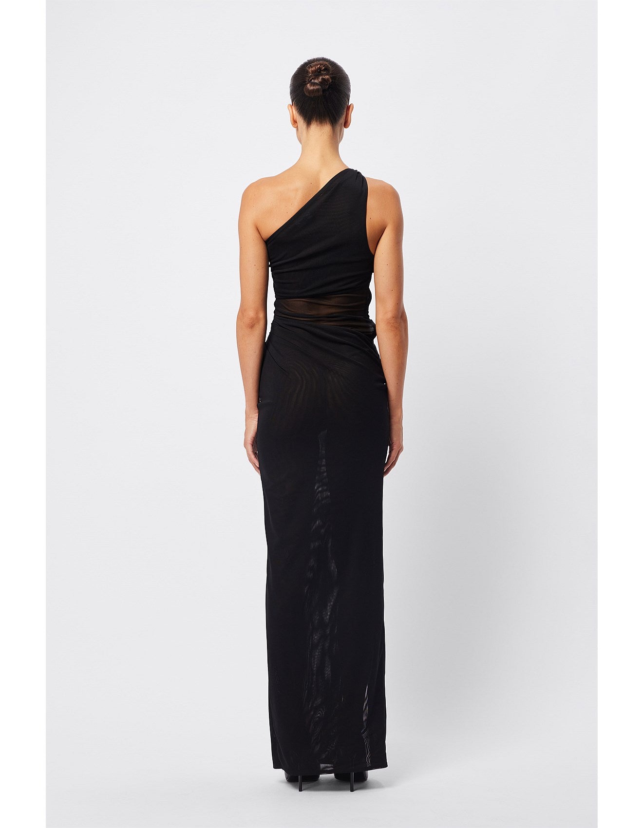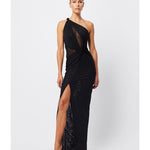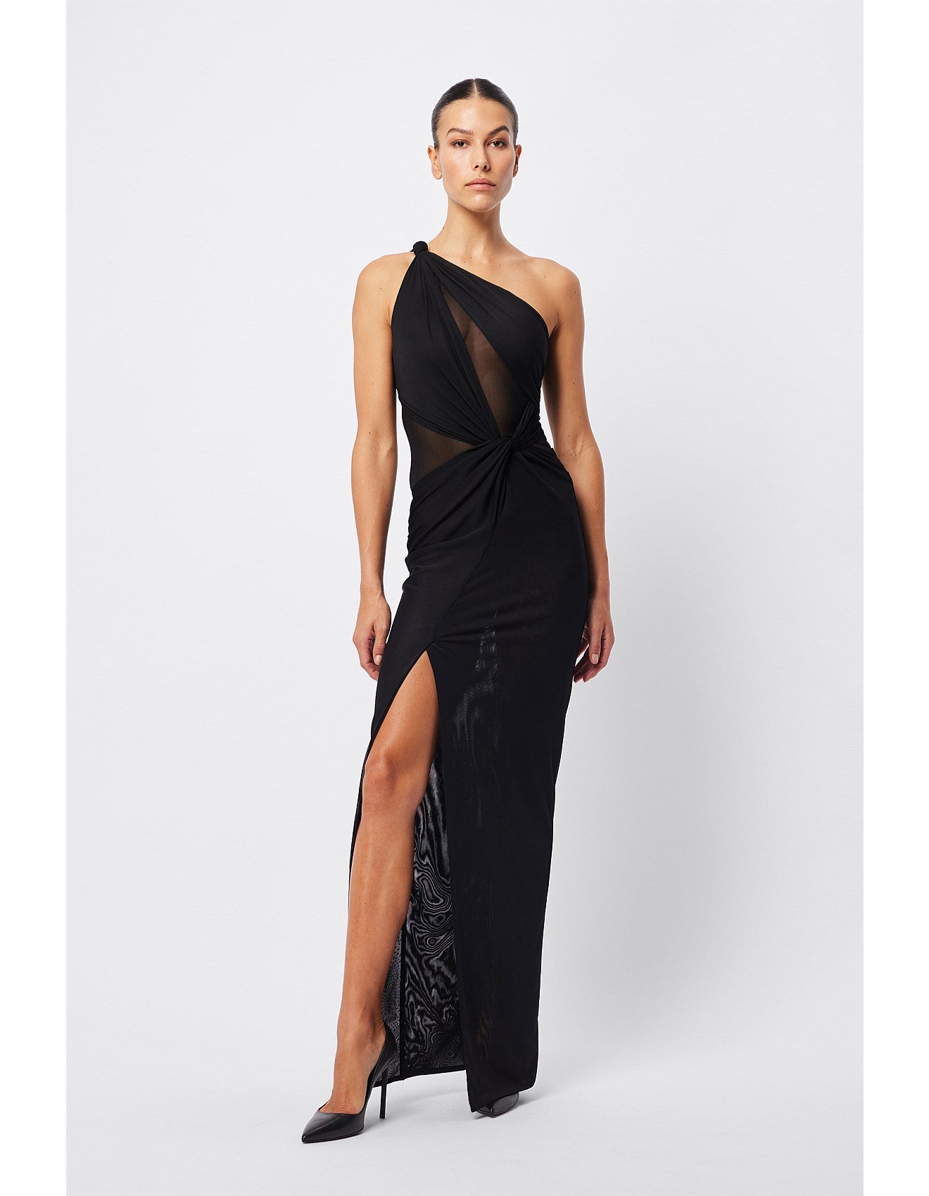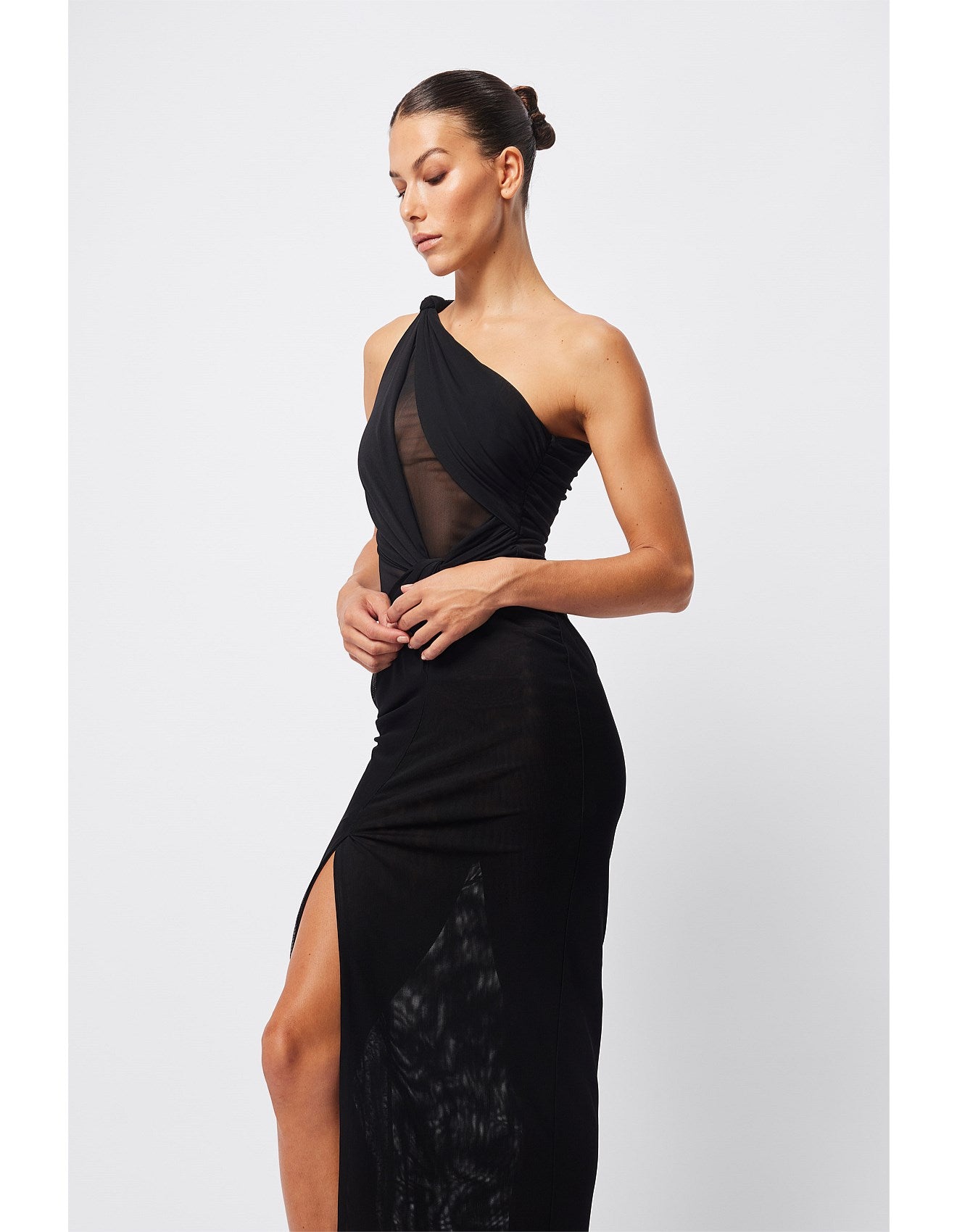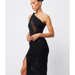 The Rebound Maxi Dress in black is a statement piece. It features a double-layer mesh fabrication, one-shoulder design with knot detailing, side front split and twist detail at the waist for a sleek, body-skimming fit. Pair with elegant heels and a clutch to achieve a polished and sophisticated look for any event.