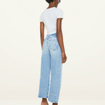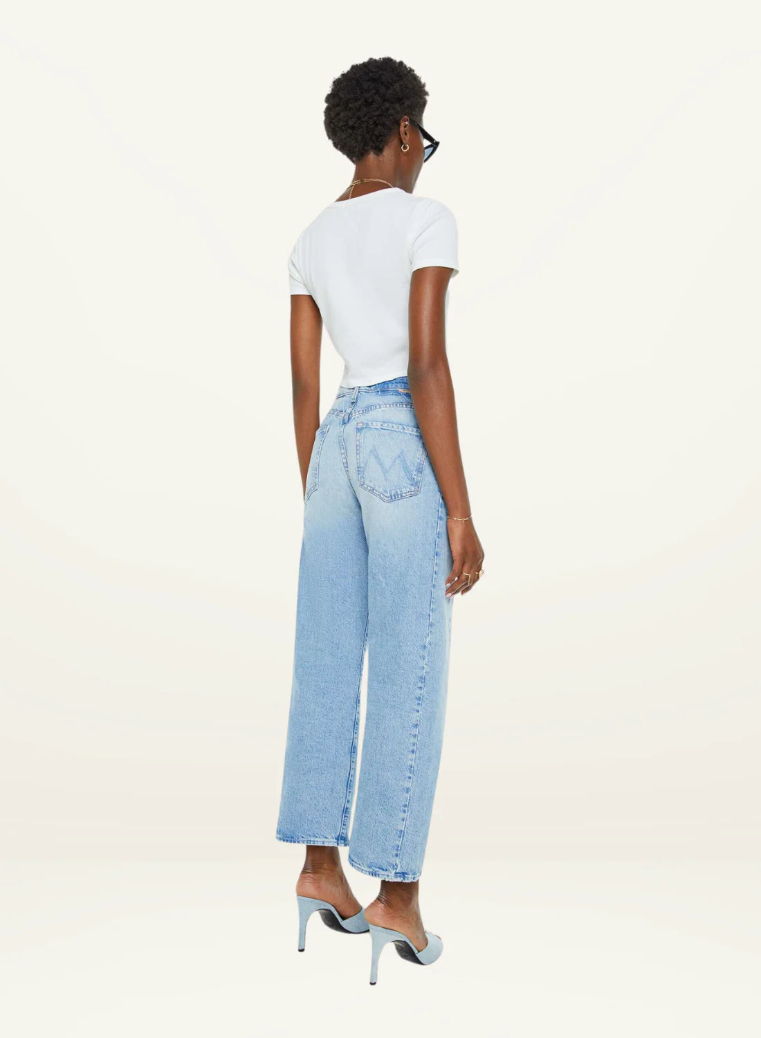 High hopes. A super high-waisted jean with a wide, curved leg, an ankle-length inseam and a clean hem. Made from SUPERIOR denim, Did You Bring Me Anything? is a dark blue wash with whiskering and fading at the knees.