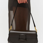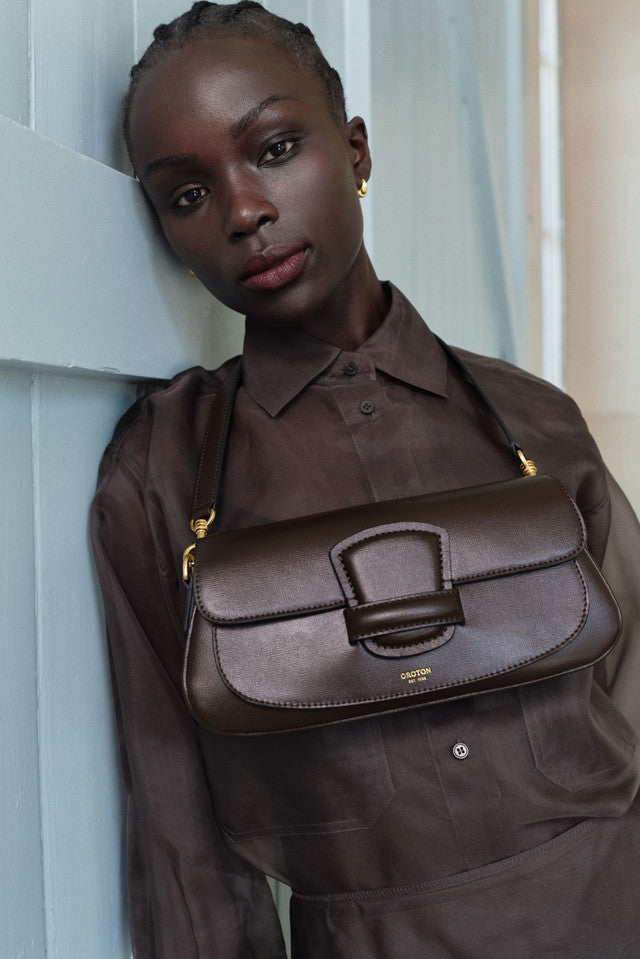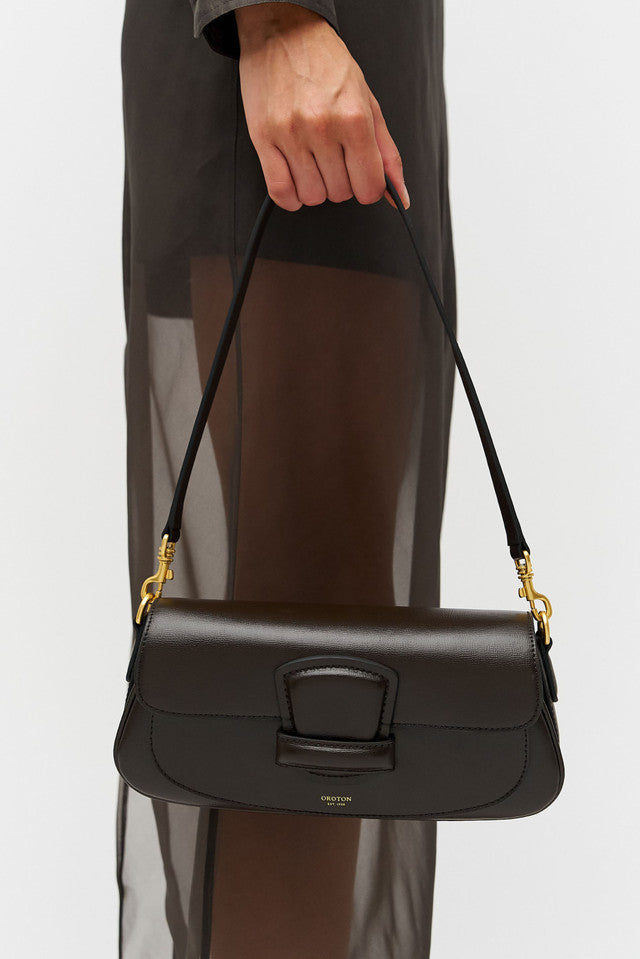 The Carter Baguette is a refined statement piece in structured Saffiano leather, featuring a top flap with a magnetic closure. It offers a main compartment, a back-wall card pocket, and a front slider pocket. Finished with a non-adjustable shoulder strap and a detachable, adjustable crossbody strap.