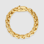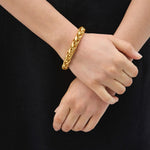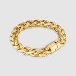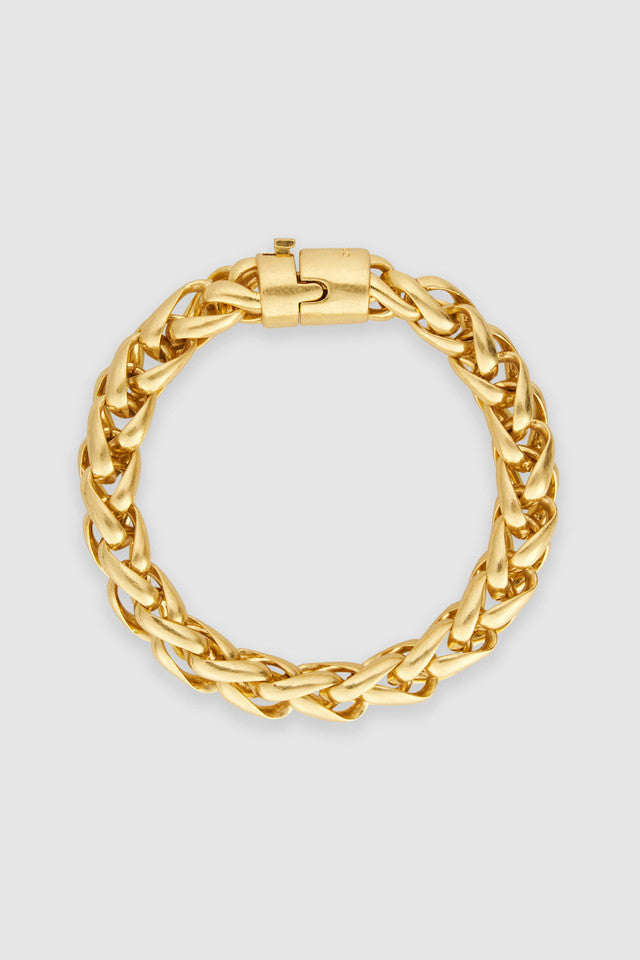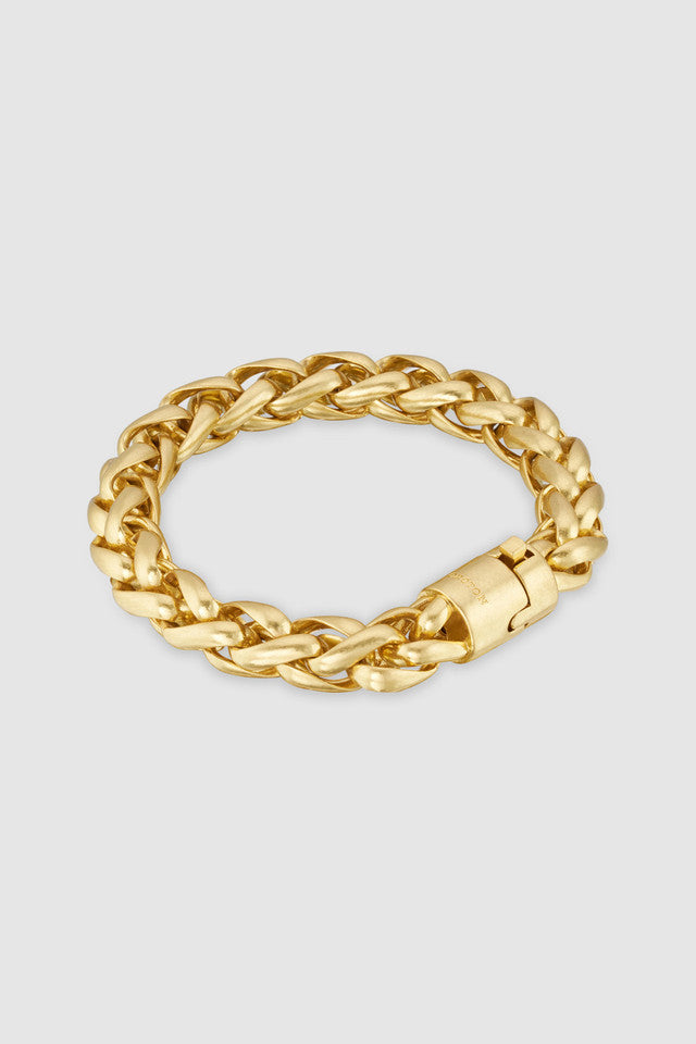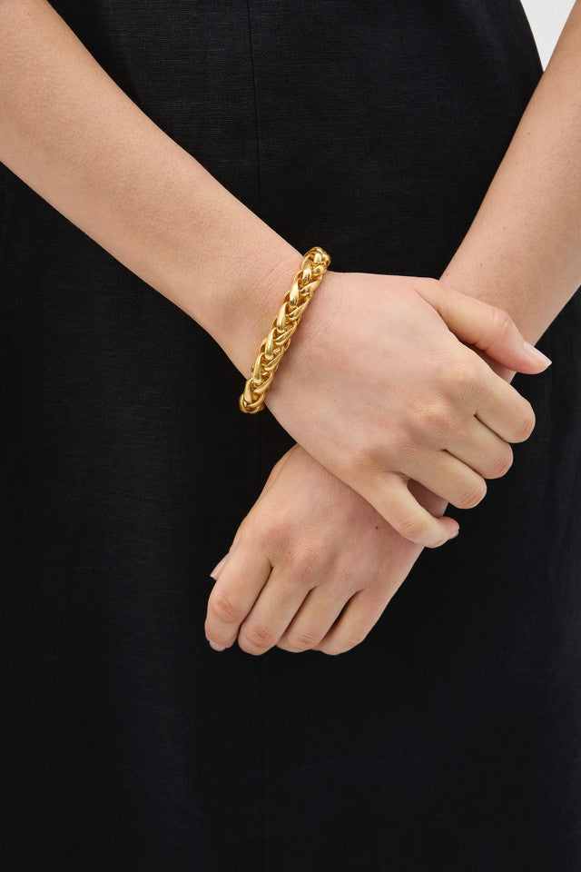 The Romy Bracelet is designed with sculptural chain links, finished in a softly brushed 18K worn gold plating. Crafted from premium brass and secured with a sleek box clasp, this elevated piece brings fluidity, texture and strength to any refined jewellery stack.