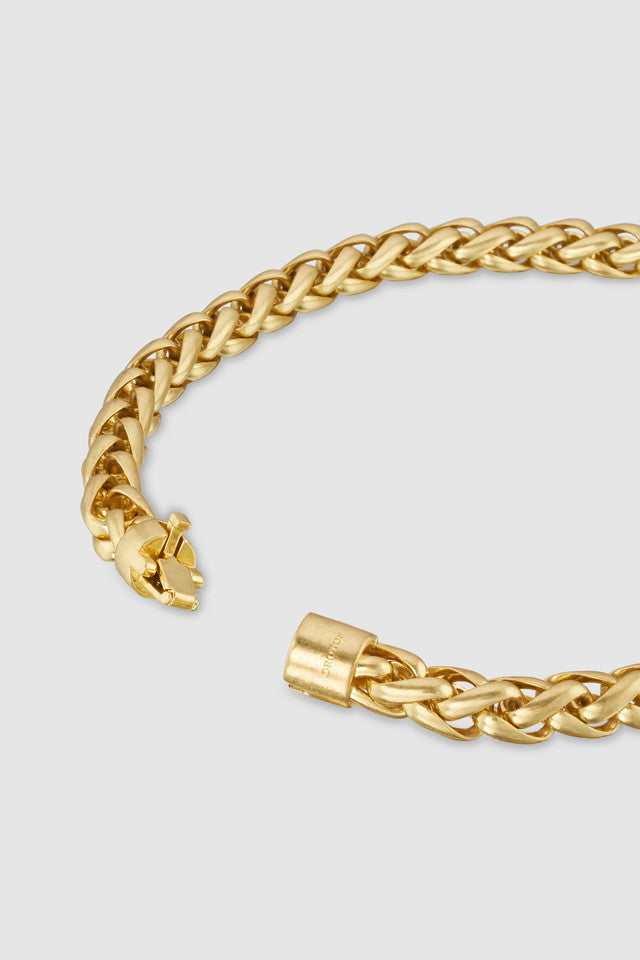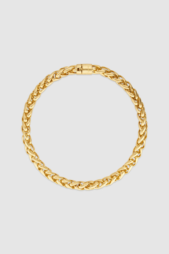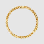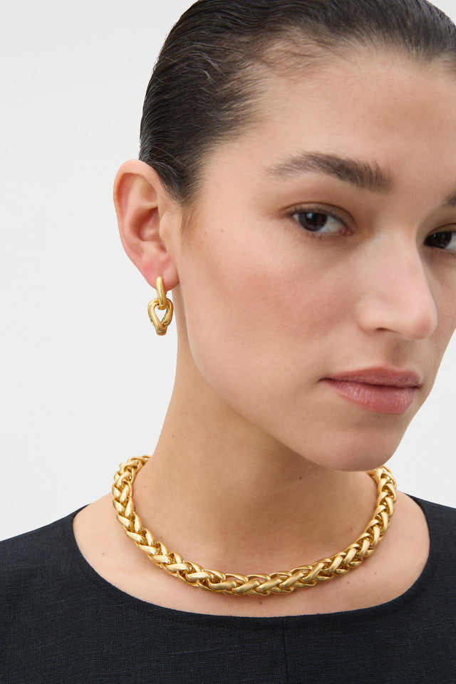 The Romy Necklace is a bold, interlinked silhouette plated in brushed 18K worn gold. Designed to sit just at the collarbone, each sculptural link reflects light beautifully. A secure box clasp offers a seamless finish, making it ideal for everyday wear or elegant layering.