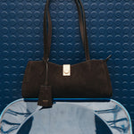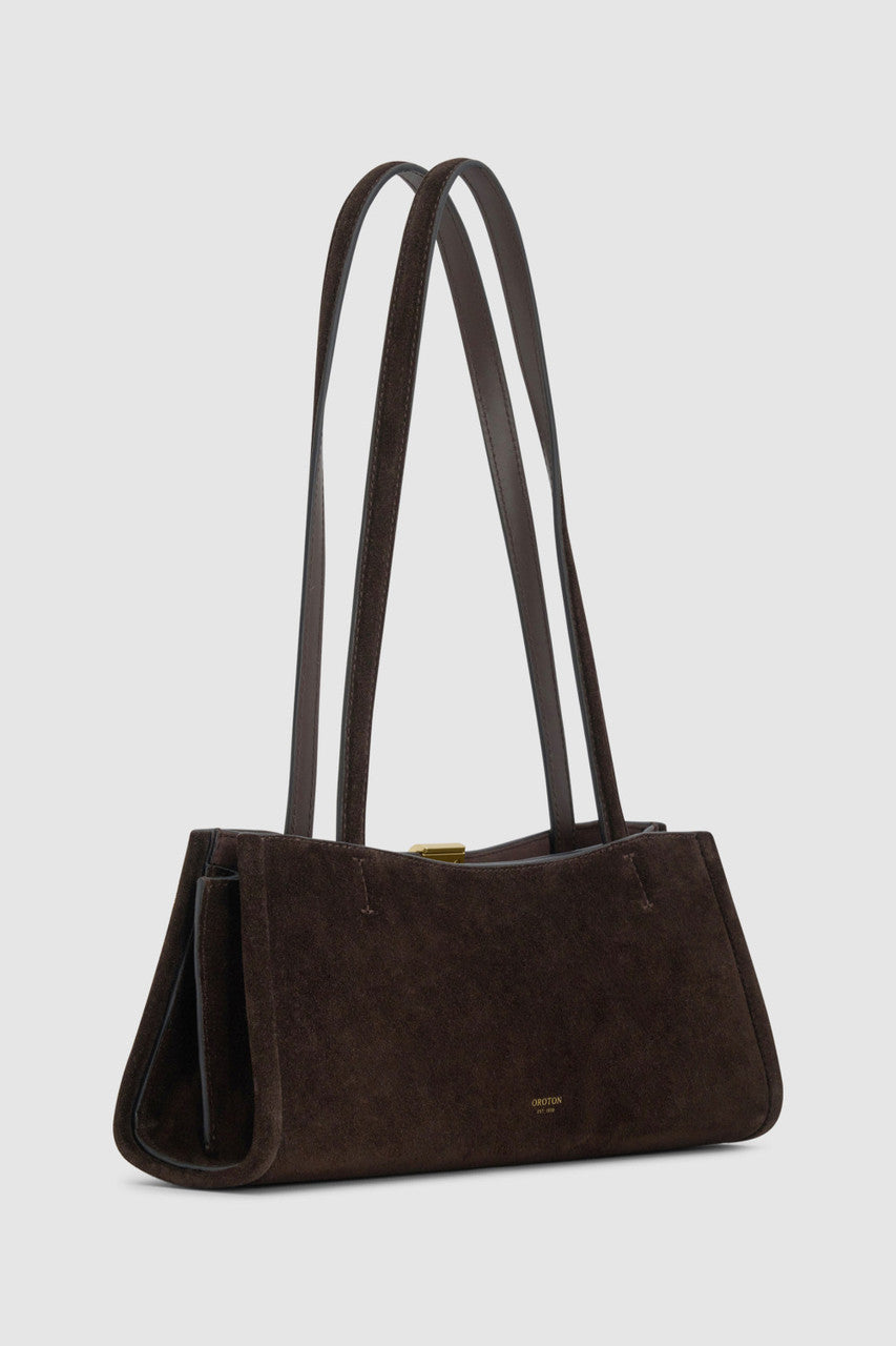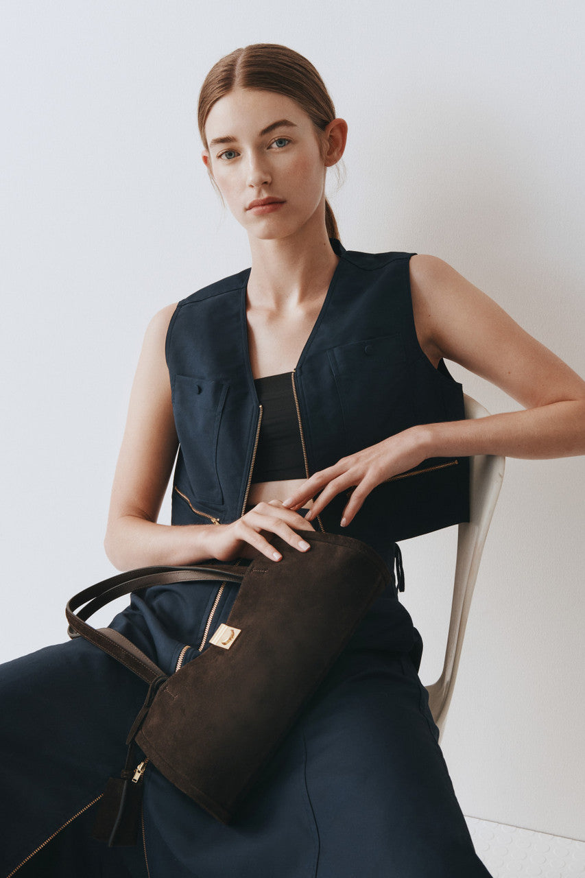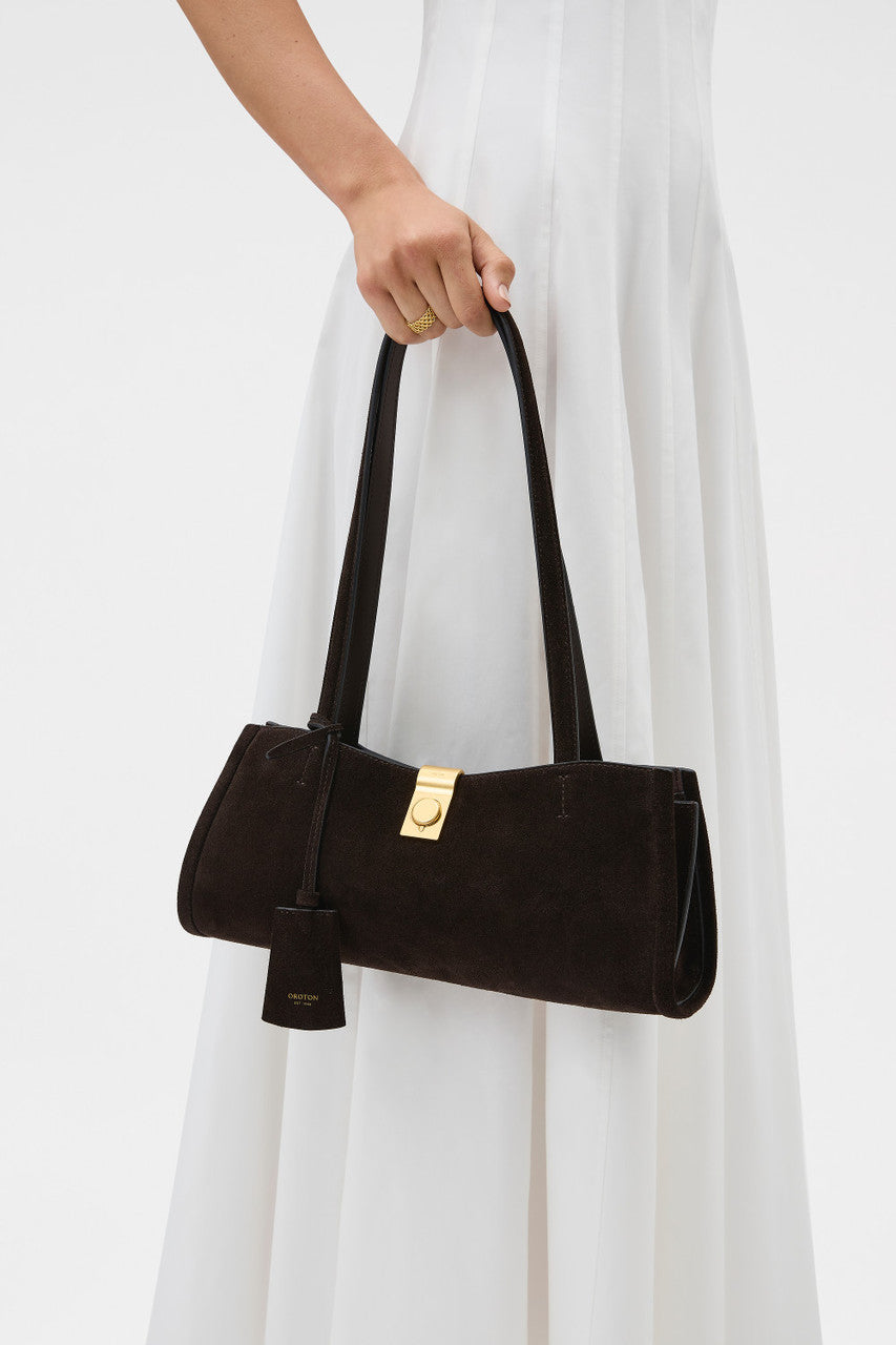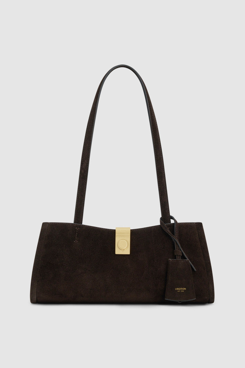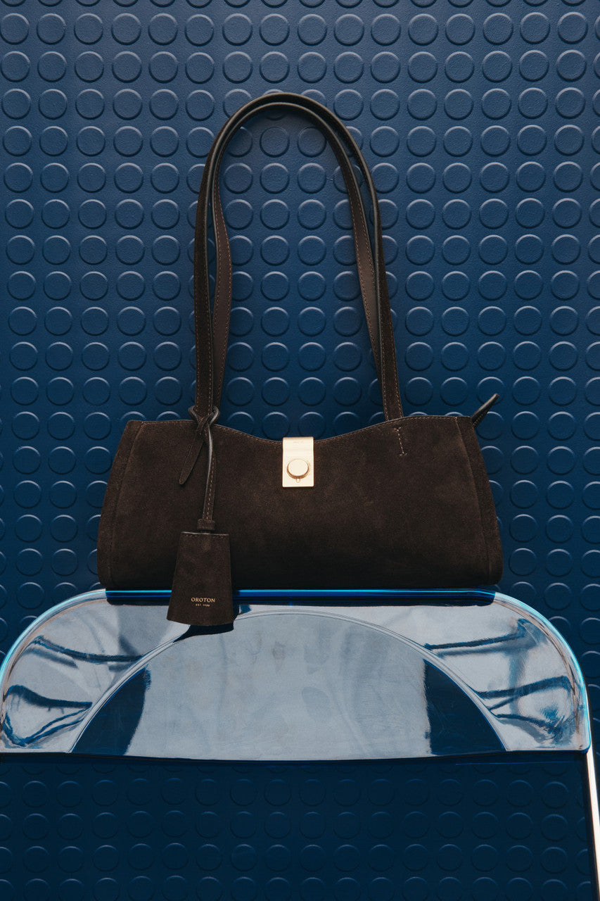 The Mille Baguette Suede blends premium suede with smooth leather trims for a softly structured, elevated finish. A top zip reveals a microfiber-lined interior with considered pockets for easy organisation. Completed with brass hardware and shoulder straps, it fits an iPhone 15 Pro Max with refined ease.