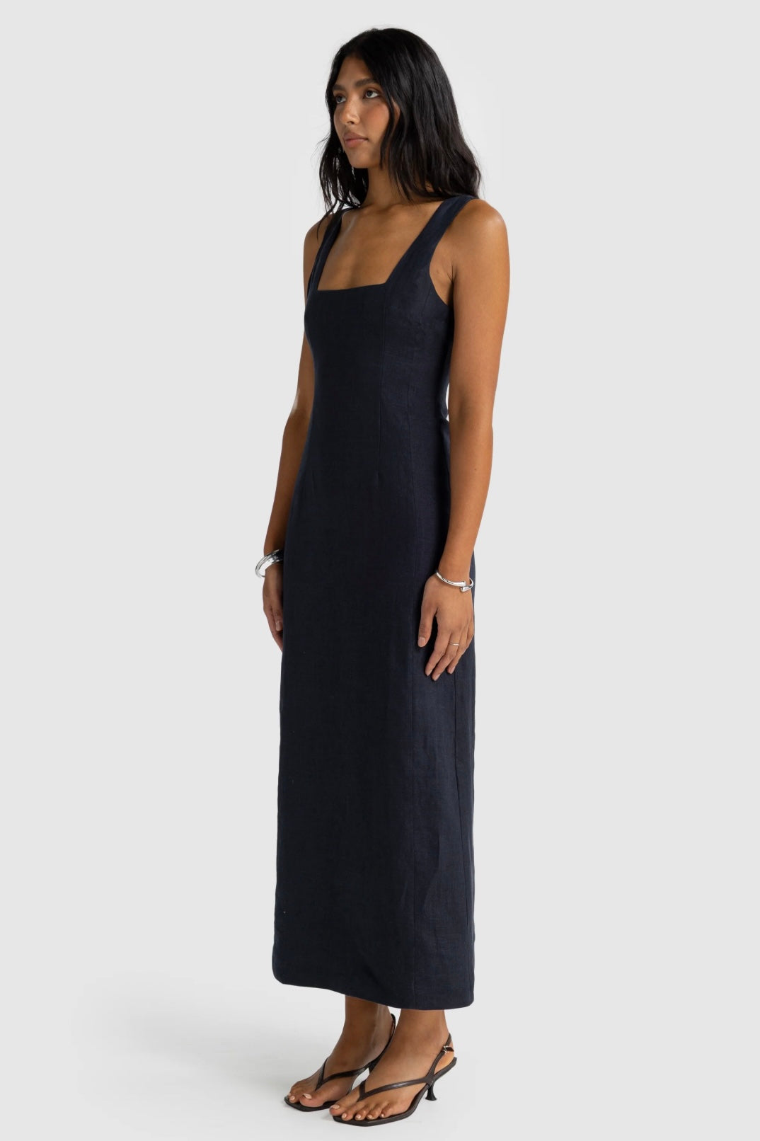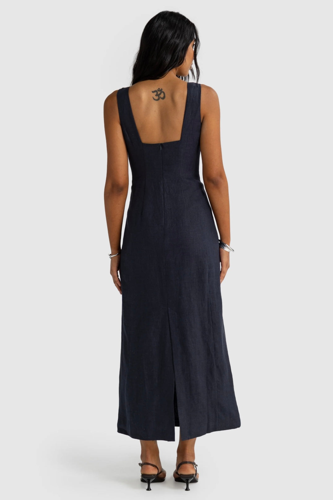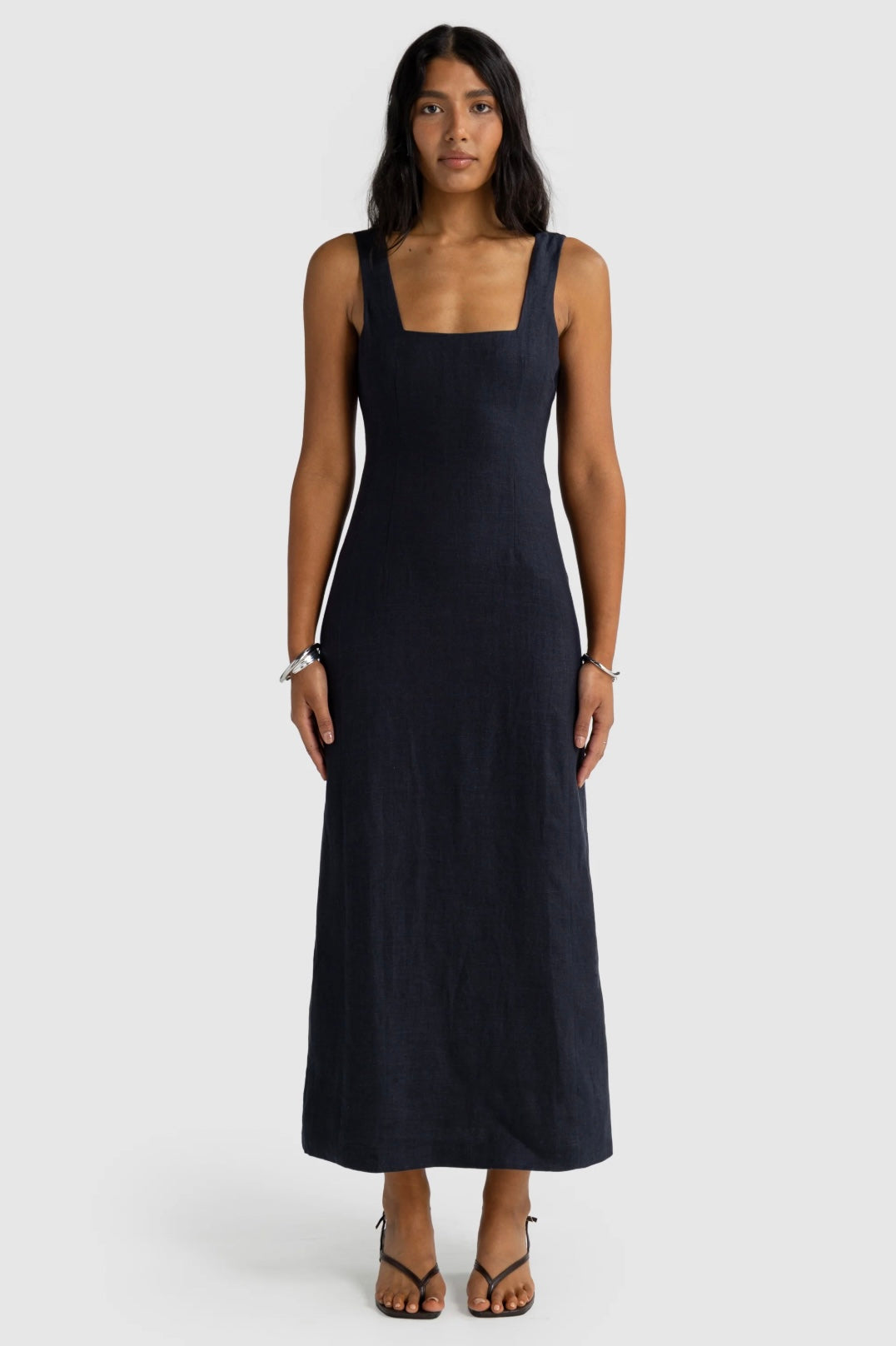 The Zoey Linen Full Length Dress is an effortlessly elegant wardrobe staple designed for timeless wear. It features a structured silhouette with a square neckline, thick straps, and a flattering fitted bodice that flows into a full-length skirt. The back showcases a low square cut with an invisible zip closure and a back vent for ease of movement.