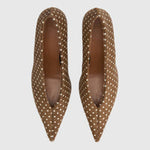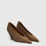 CAMILLA AND MARC Rhys pointed polka dot pump in Italian pony hair leather, nubuck leather sole, angled 85mm heel. Made in Portugal.