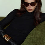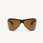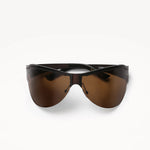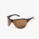 These sporty, 90s-inspired sunglasses feature brown lenses and matte brown stainless steel frames that wrap around your temples, offering enhanced sun protection and a sleek, modern look.