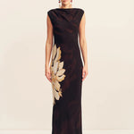 High cowl maxi dress in the natura floral print in a semi-sheer georgette.