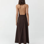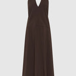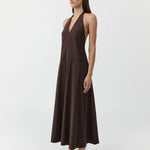 The Halter Plunge Dress offers fluid elegance with its 7/8 length and flattering halter V-neckline. Featuring bust darts for a tailored fit and curved hip detailing that enhances its refined silhouette. A full circle skirt adds movement, while the cotton blend fabrication ensures a light, airy feel, making the Halter Plunge Dress a versatile style for both casual and occasional dressing