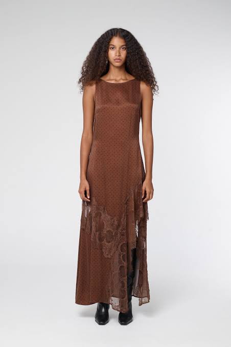 Crafted from sandwashed cupro, the Visions Lace Frill Dress is designed with fluidity and movement in mind. The clean, sleeveless bodice falls into an asymmetric hemline, framed by delicate lace paneling that adds depth and dimension. A thigh-high split enhances the drape, creating an effortless interplay between structure and softness.