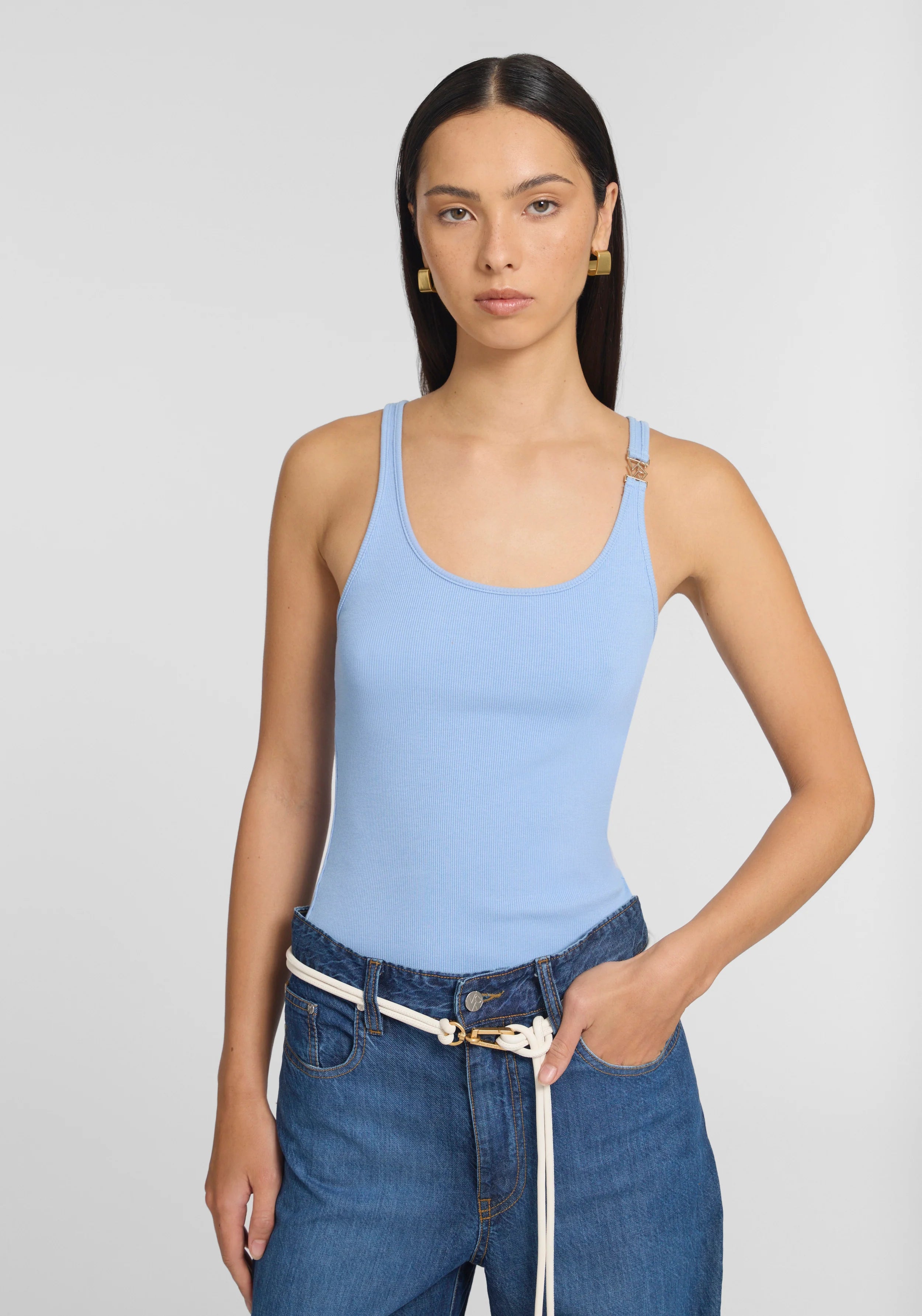 Bring new life to your everyday essentials with the Victor Tank, an elevated take on the classic tank top. Crafted from our signature 2x2 organic cotton rib in a saltwater blue hue, this fitted silhouette showcases a flattering scoop neckline and sleek V&W hardware on the strap. The perfect starting point for any outfit, it exudes effortless luxury with every wear.