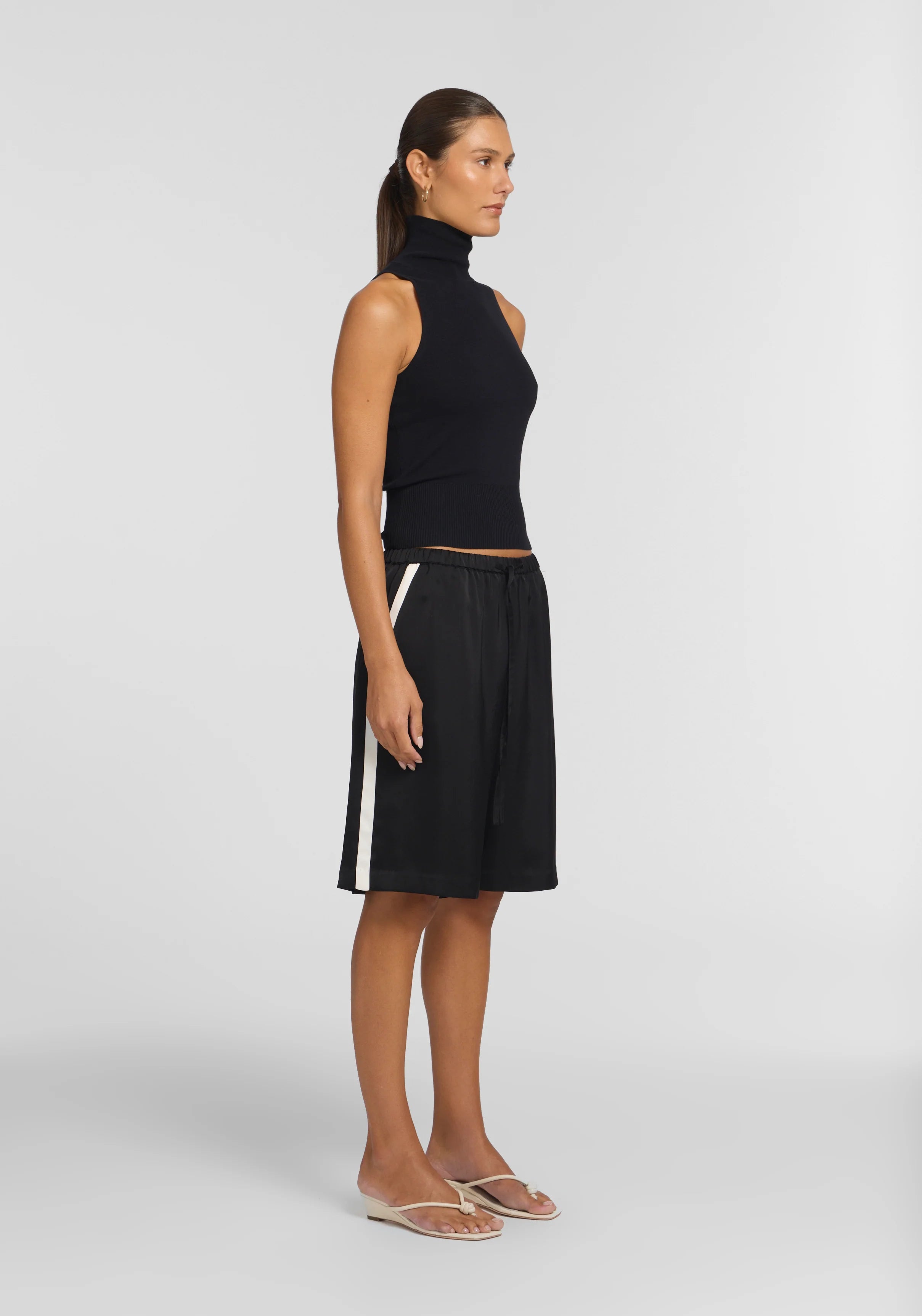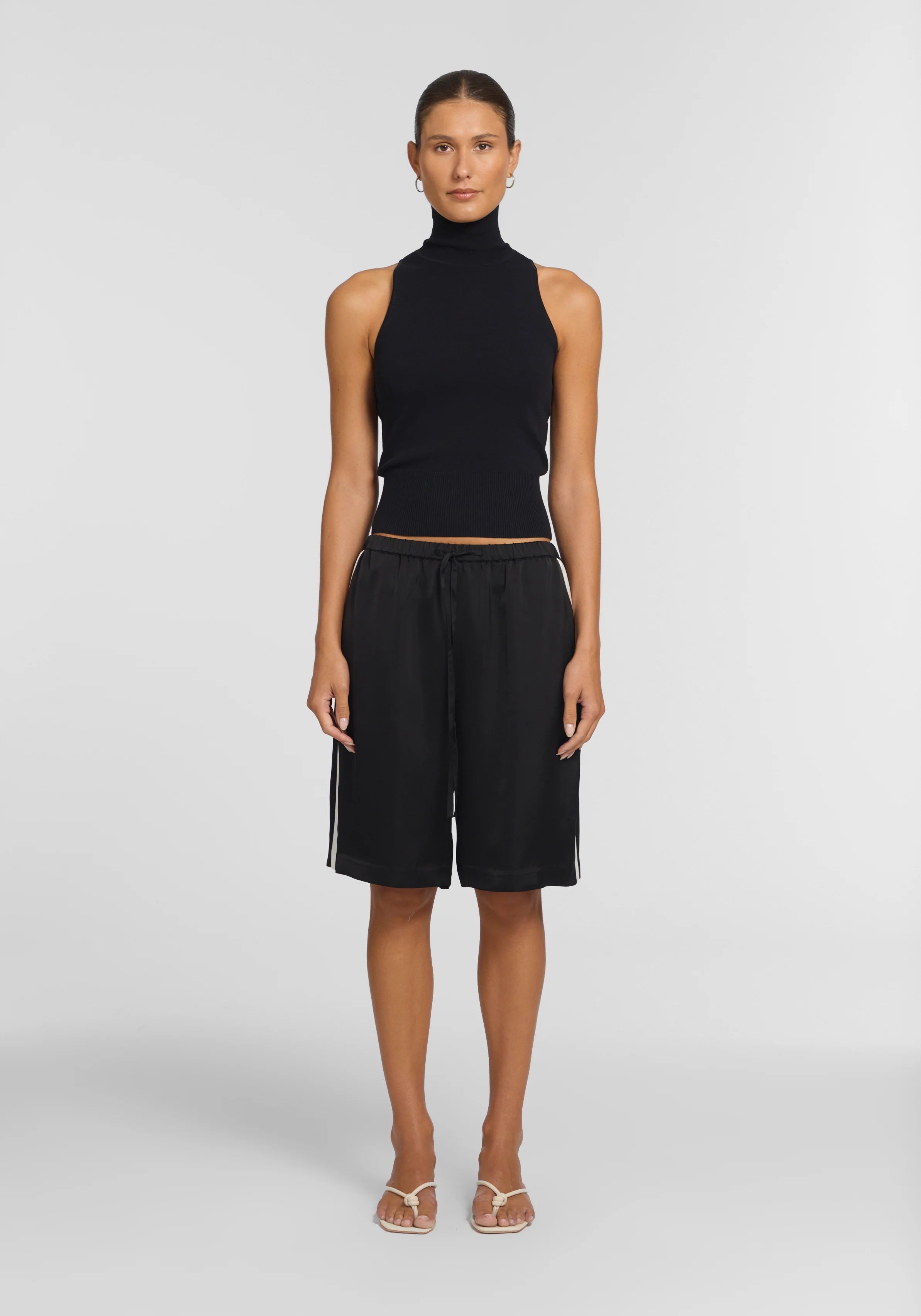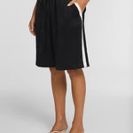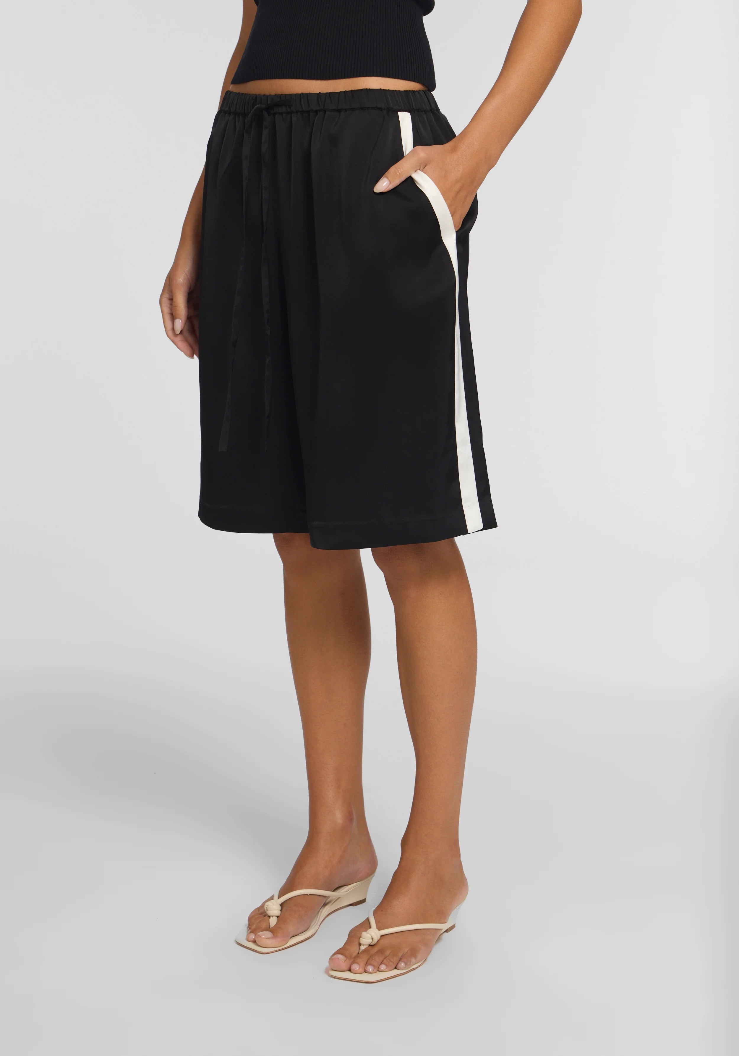 The Spotlight Short reimagines our best-selling Rocky Pant, tailored in our signature black cupro blend. With a relaxed, long short silhouette, elasticated waistband with drawcord, pockets, and a contrast ivory panel down the side seam, it offers fluid, sophisticated ease. A versatile sports-luxe essential, perfect for work, holidays, and all the moments in between.