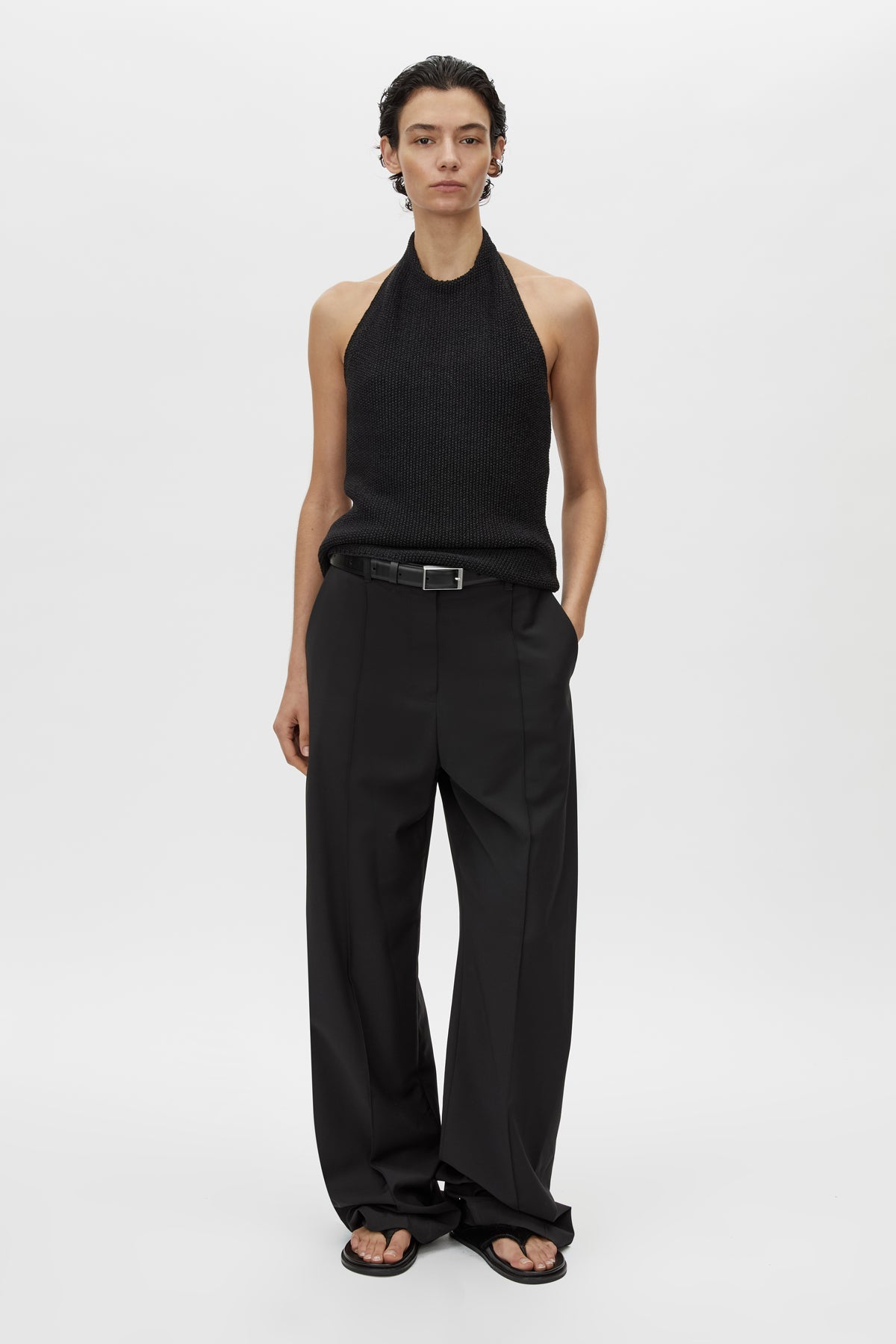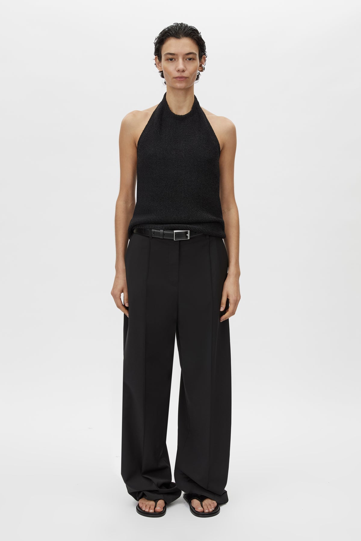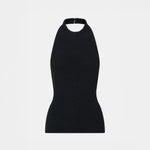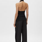 CAMILLA AND MARC Arizona textured knit halter top in a black cotton and paper blend. Internal corozo button closure at centre back.